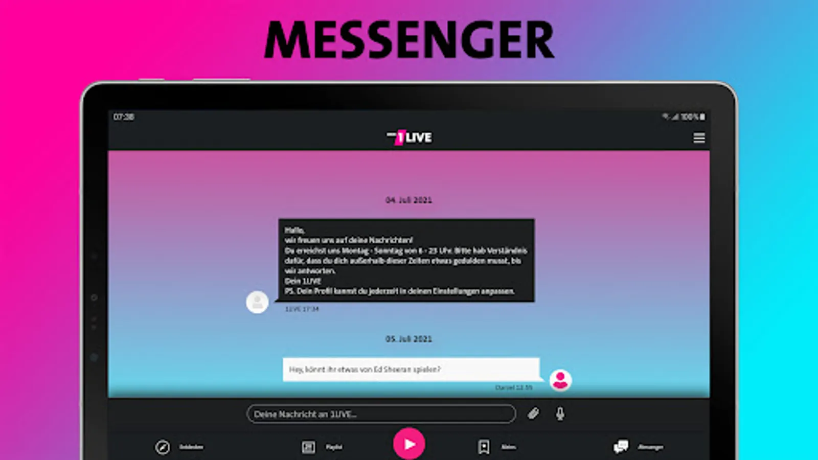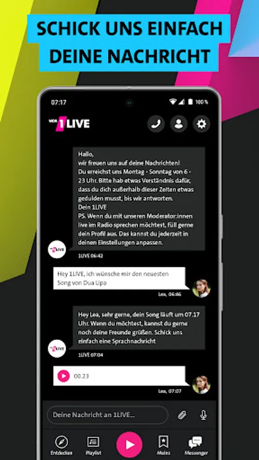 Our messenger is your direct line to 1LIVE. Send us text or voice messages, photos or videos, or call us directly and help shape our programming. Tell us what's going on and we'll pass it on! Take part in our competitions or make a request for your favorite song.