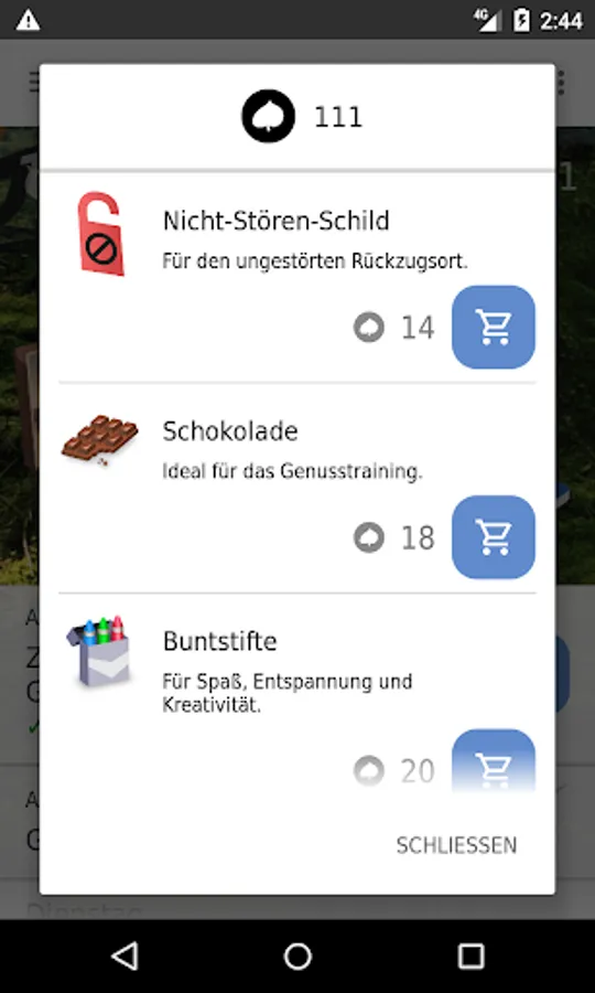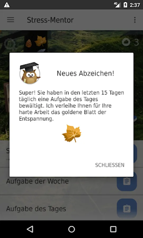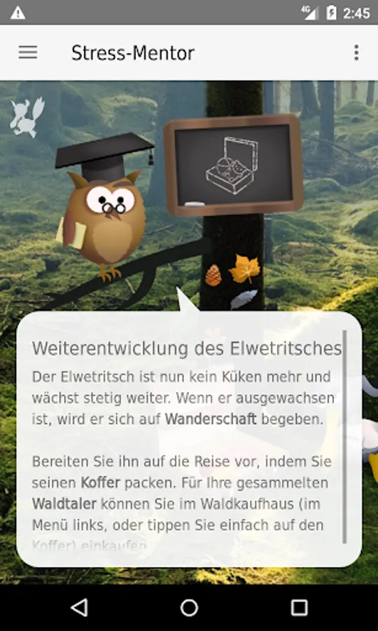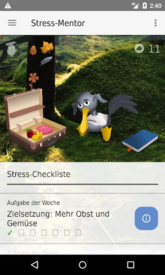To support the regular use of the APP, playful elements have been included, e.g. the choice of daily exercises (a total of 77 different tasks), items that can be exchanged for virtual items, a bird-like mythical creature that reflects the USER's diary entries, a camera feature that captures the evolution of the fable, and a wise owl that captures the user with tips around the APP use and the topic stress supports.