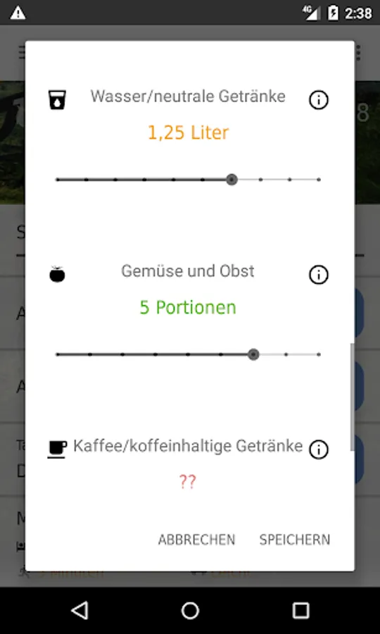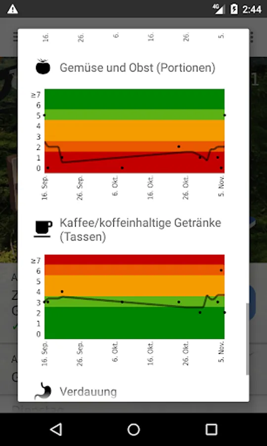 Self-observation: In a diary can sleep (quality and quantity), sports (duration, stress, steps), diet (unsweetened, neutral drinks, alcohol, caffeine, fruits and vegetables), digestion, subjective perceived stress level, prevailing mood, as well as positive and negative events of the day are recorded and viewed in a long-term overview