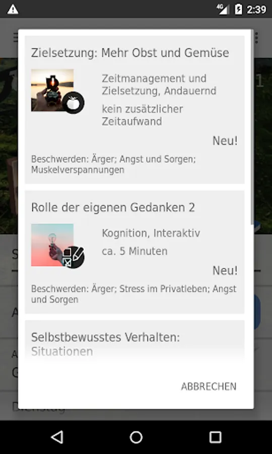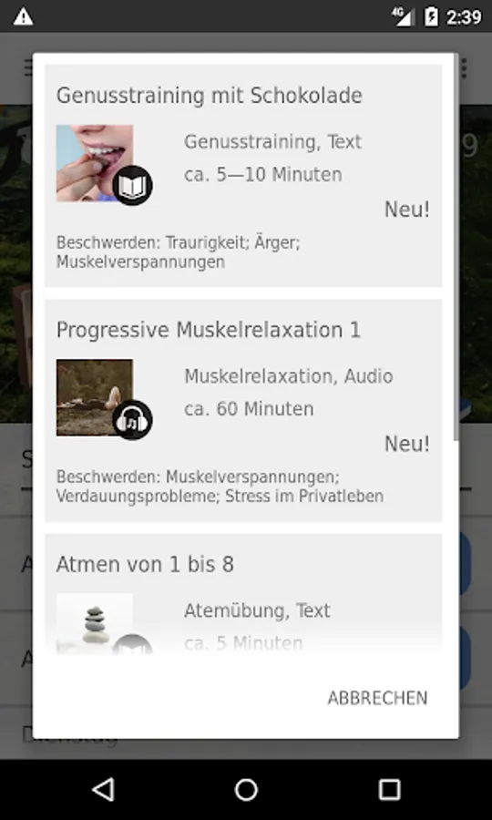 Every week, a stress checklist is used to check physical (muscle tension, digestive problems, sleep problems, tension-related head, neck and back problems) and emotional stress indicators (anxiety, sadness, anger, stress at work and in private life). Based on this, the APP selects the order of stress management strategies.