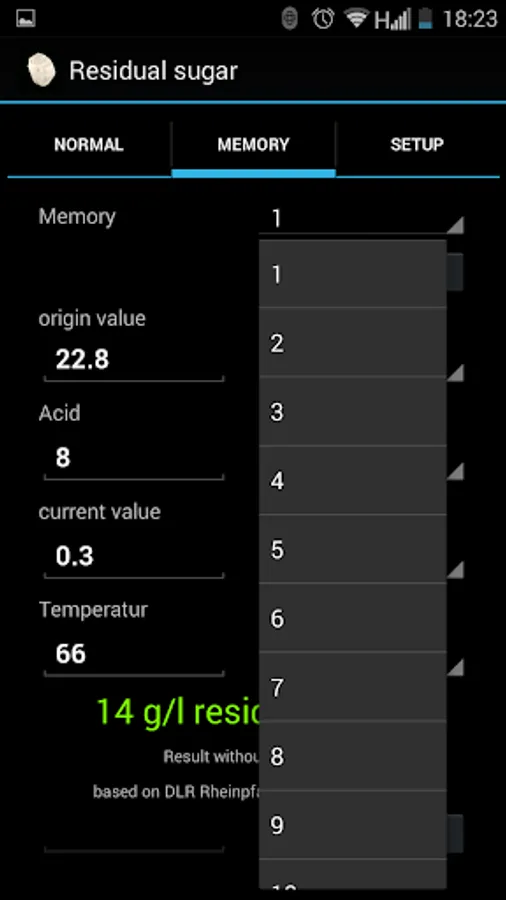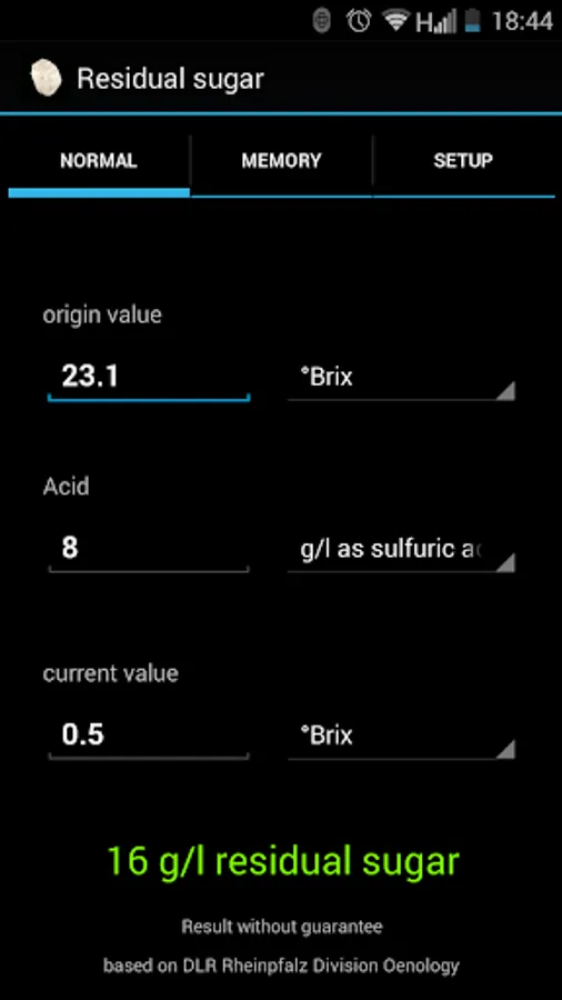 Calculate the current value of residual sugar fermenting musts by the DLR Rheinpfalz Neustadt method.