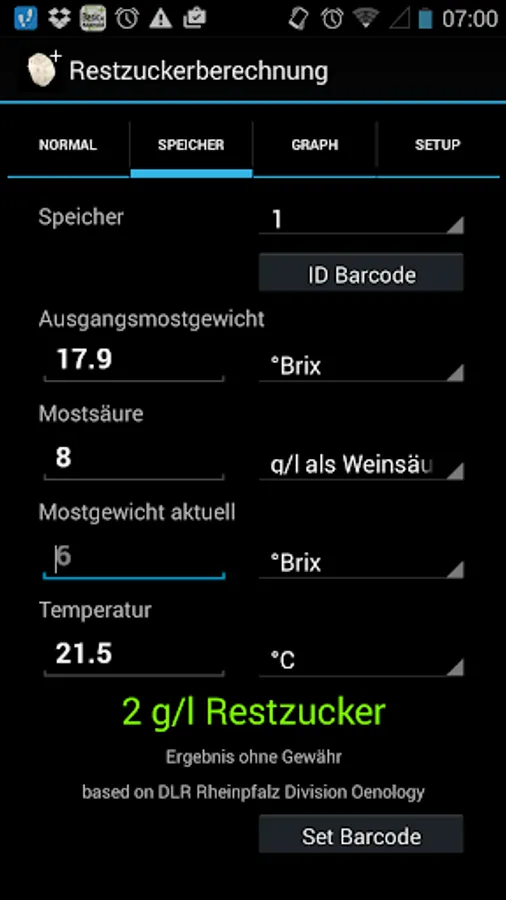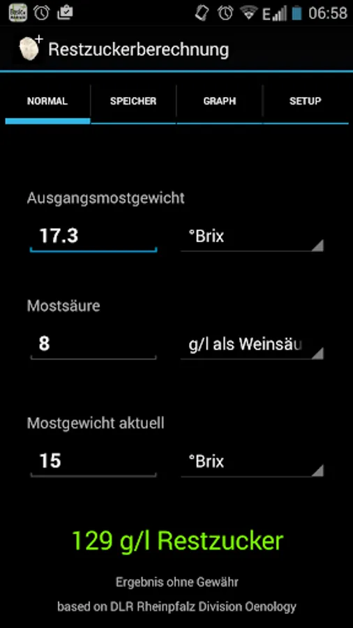 Calculation of the current residual sugar value of fermenting musts according to the method of the DLR Rheinpfalz Neustadt, Department of Enology and winery horns.