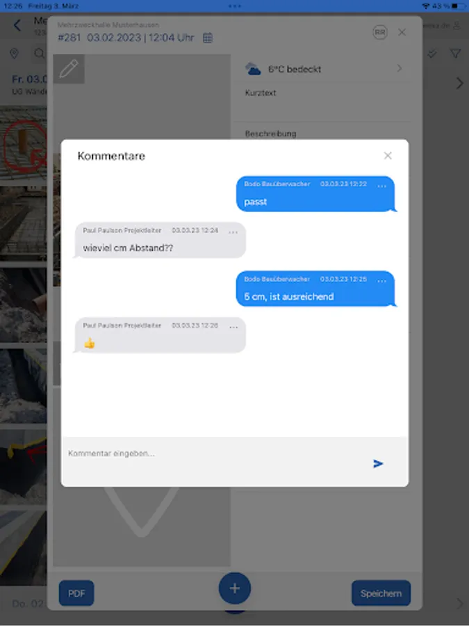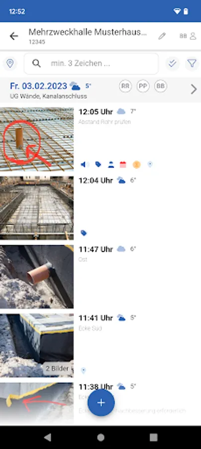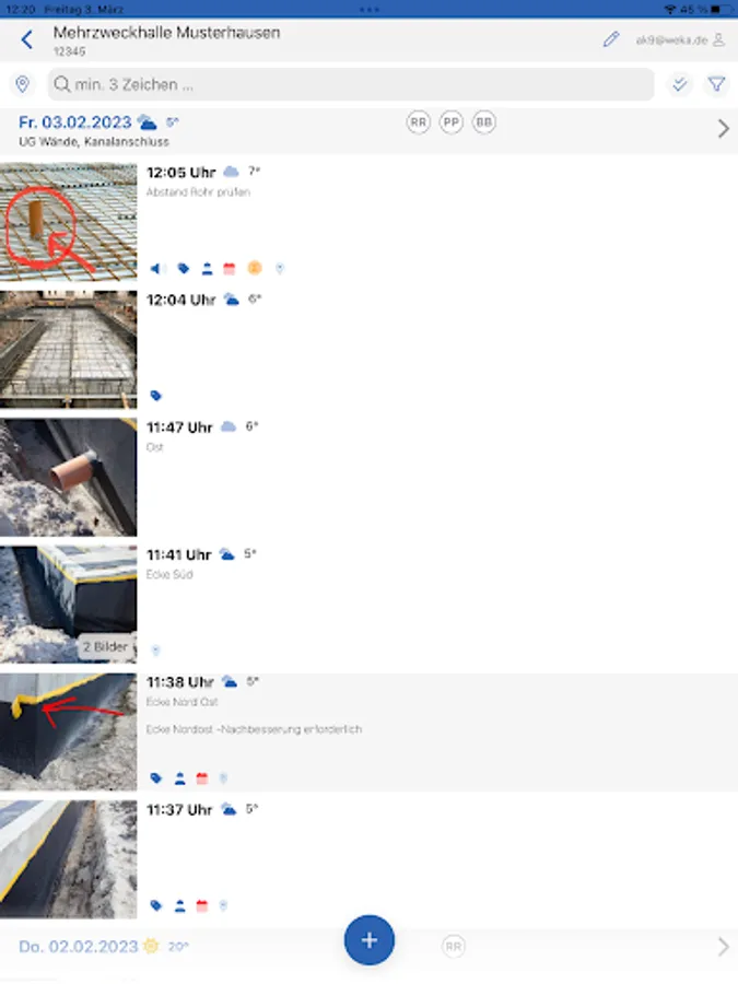 All information is stored directly online. In this way, everyone involved can access the latest data at any time. And if there is a building site with no radio coverage: with the offline function, you can temporarily save captured photos and texts offline!