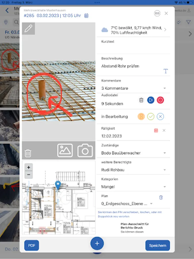 Perfect for the construction site: the intuitively easy-to-use app saves you a lot of time. Start your project with one click. Then just take a picture and dictate text. The app automatically documents the time, place and weather. Without mandatory mandatory entries.