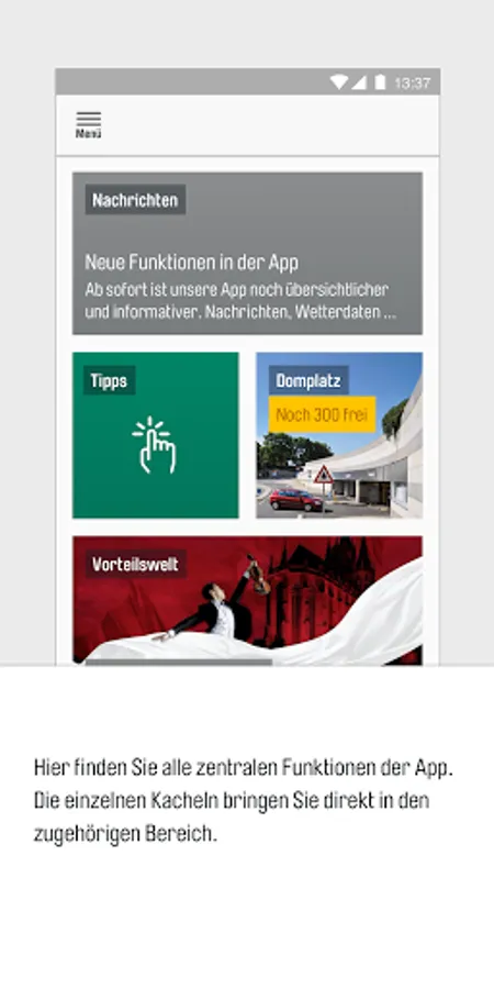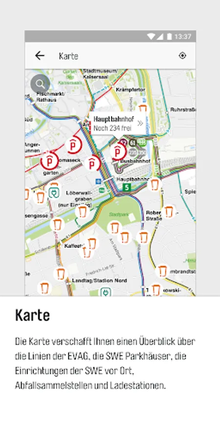 The app shows you the current level of the Erfurt parking garages. You can choose to display the available parking spaces in your favorite car park on the home page.
