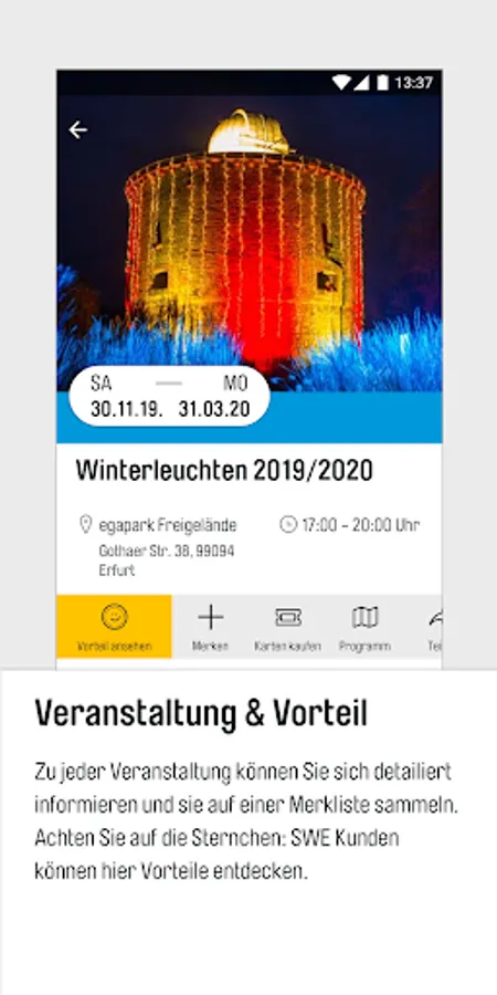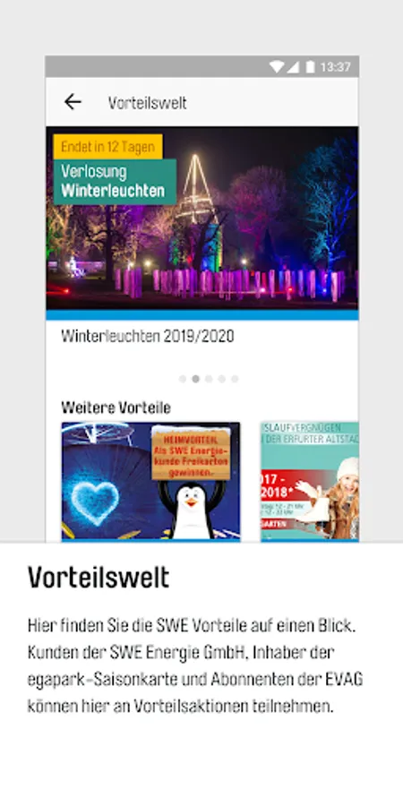 As a customer of SWE Energie GmbH, as a subscriber to EVAG or as a holder of the BUGA season ticket, you can enjoy exclusive advantages. Our app presents you all the advantages in a compact overview and offers you the opportunity to take part in your desired promotions directly via the app.