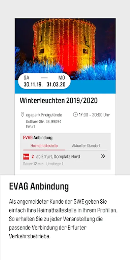 Here you will find all SWE events and selected events in Erfurt - even filtered by categories if you wish. And so that you arrive on time, the ideal connection by tram and bus is shown.