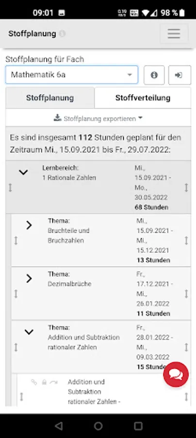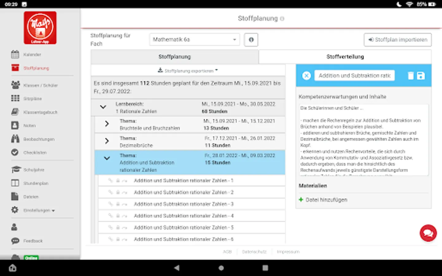 Material distribution and lesson content for the subjects with learning areas, topics and hours - automatically linked to the future teaching hours of the respective subject.