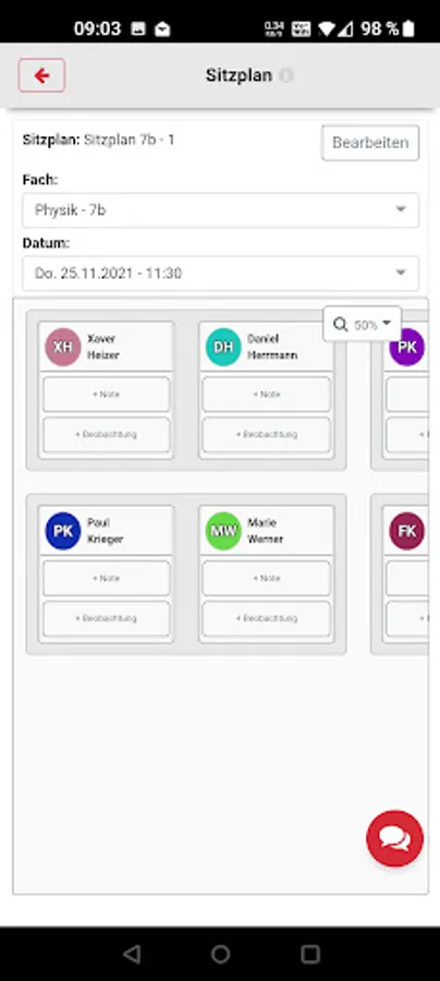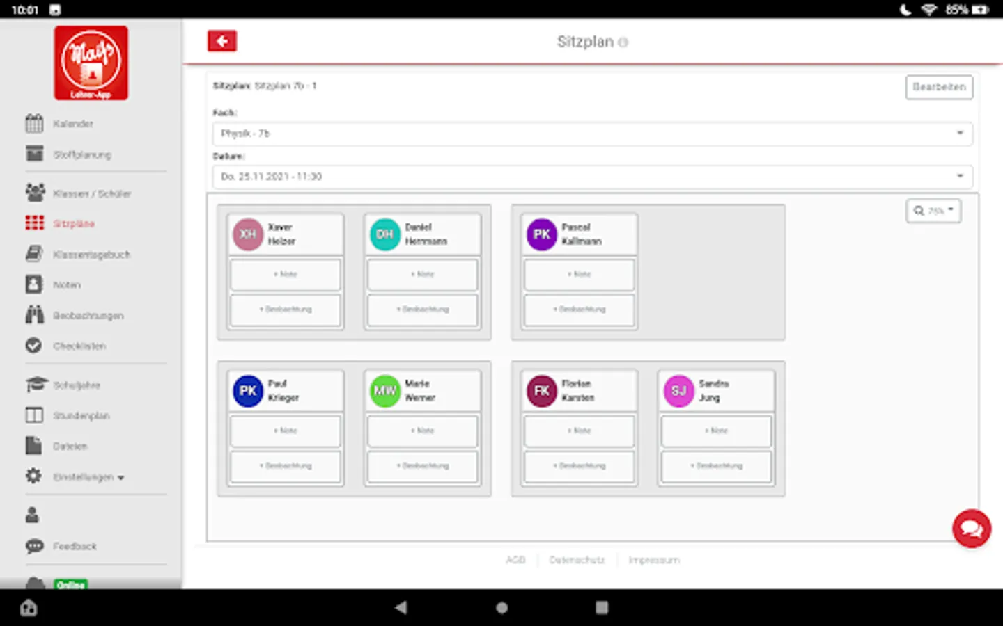 One or more seating plans per class / room, created students are simply placed by drag and drop. Up to 4 quick access buttons can be configured so that new grades, observations and checklist entries can be entered quickly and conveniently directly from the seating plan.