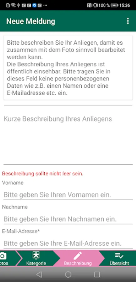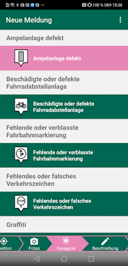 We are currently concentrating on reports from the area of bicycle traffic, such as potholes, missing/covered signs or unclearly regulated situations. Thanks to your report, we can fix the defect and make cycling in our city safer. The offer will soon be extended to other areas.