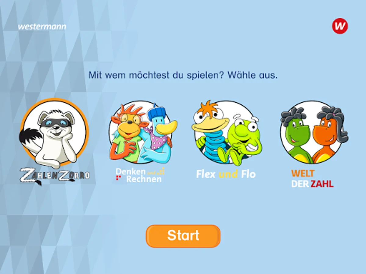 Before the training starts, the children choose to play with Zahlenzorro, with Nick and Emma from the book Denk und Arithmetic, with Flex and Flo or with Zahlix and Zahline from the world of numbers.