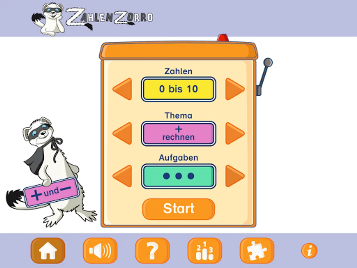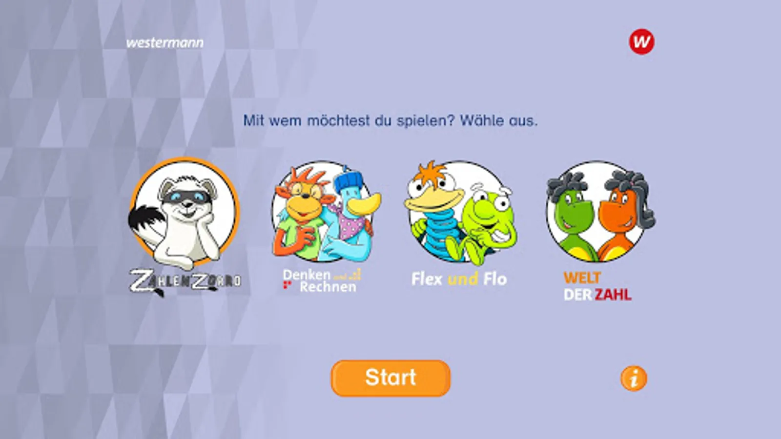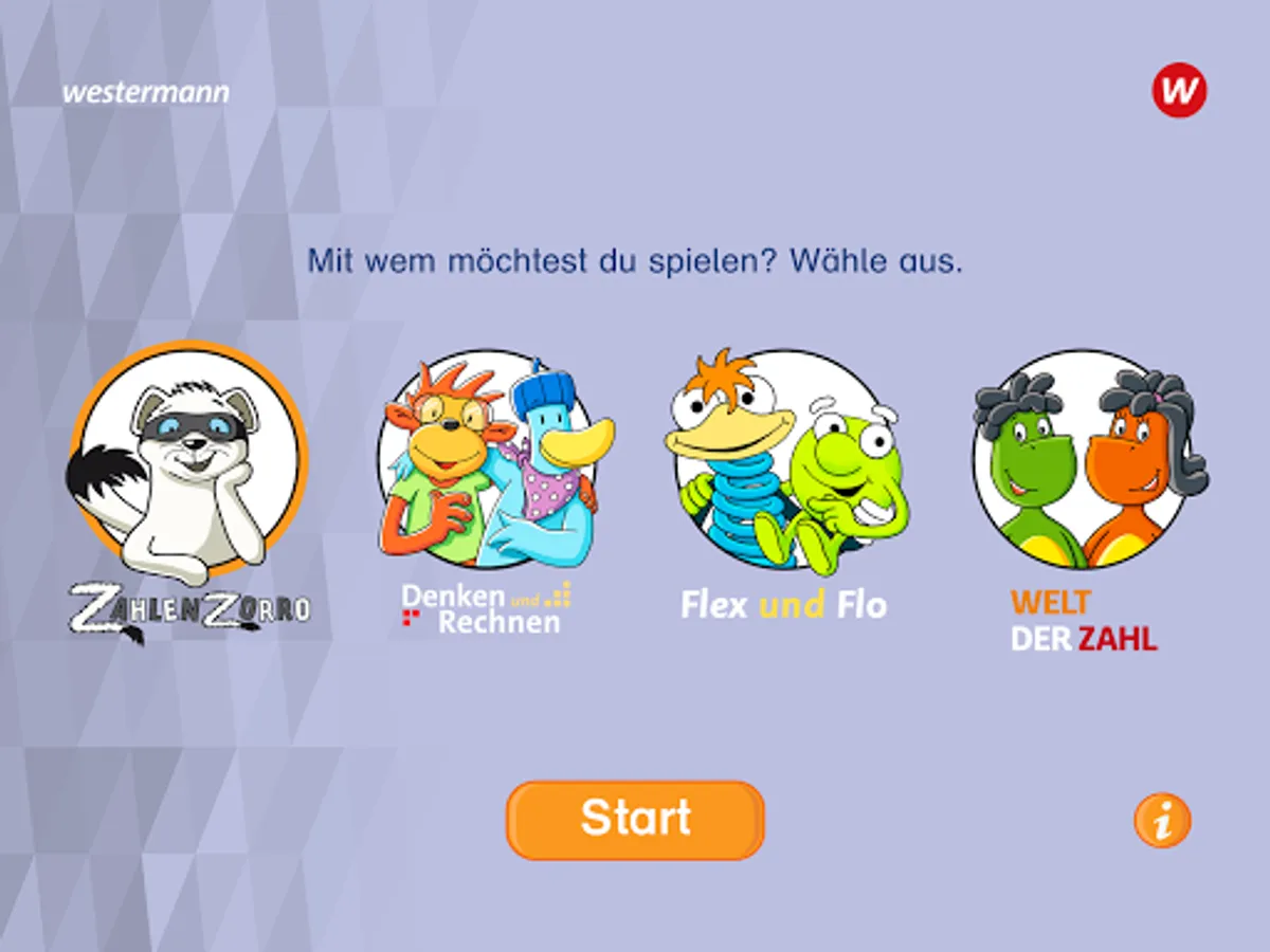 Before the training starts, the children choose to play with Zahlenzorro, with Nick and Emma from the book Denk und Arithmetic, with Flex and Flo or with Zahlix and Zahline from the world of numbers.