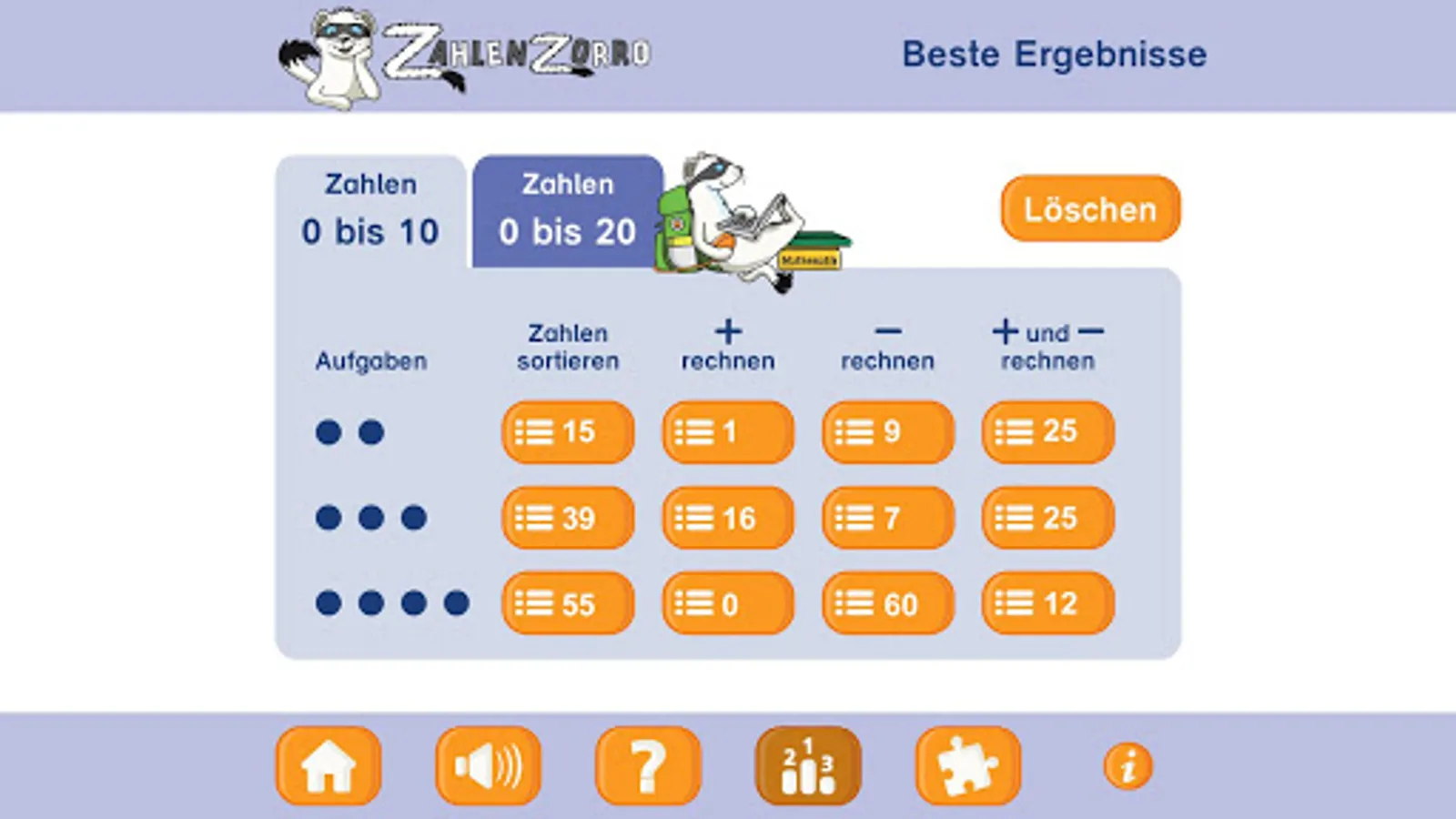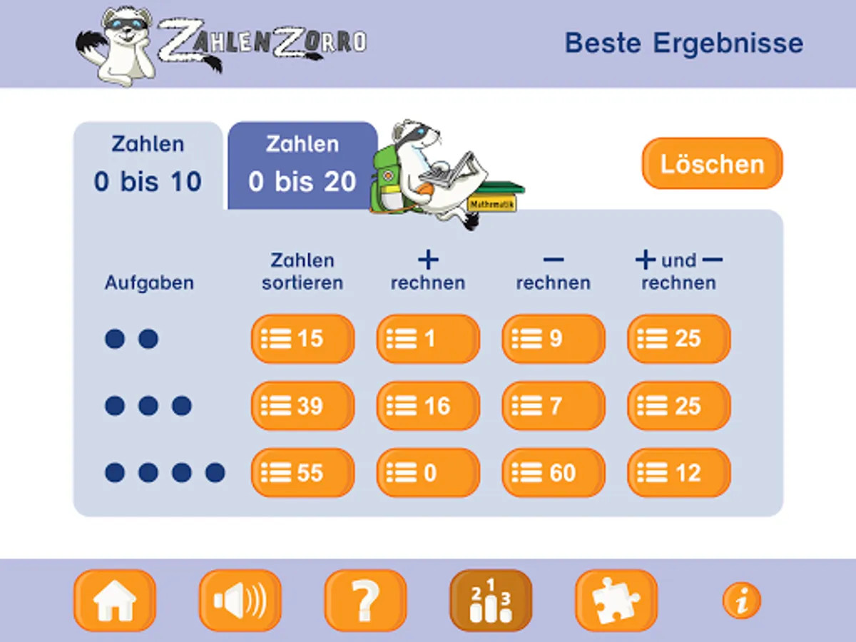 The children can choose the level of difficulty of the games themselves, depending on how many tasks they choose. The more tasks you select, the harder it gets. The goal is to solve as many tasks as possible in the given time.