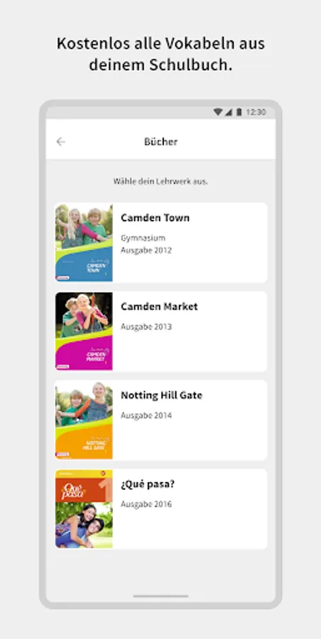 In the Westermann vocabulary trainer you will find the vocabulary for the books Camden Town Gymnasium, Camden Market, Notting Hill Gate, ¿Qué pasa? and Puente al Espanol. A complete list of all books as well as questions and answers about the app can be found at https://www.westermann.de/landing/vokabeltrainer