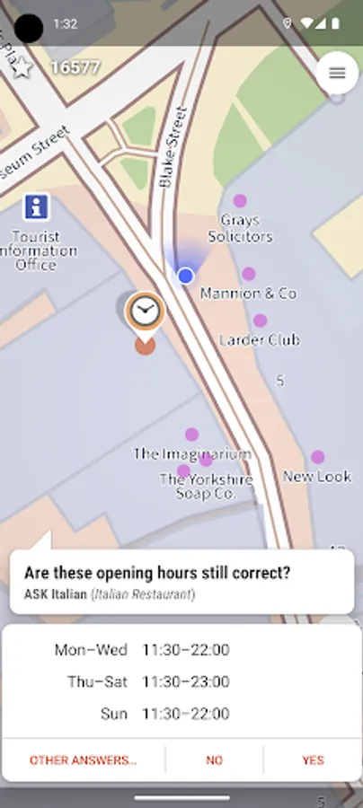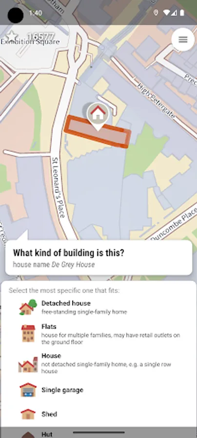 This app finds incomplete and extendable data in your vicinity and displays it on a map as markers. Each of those is solvable by answering a simple question to complete the info on site.