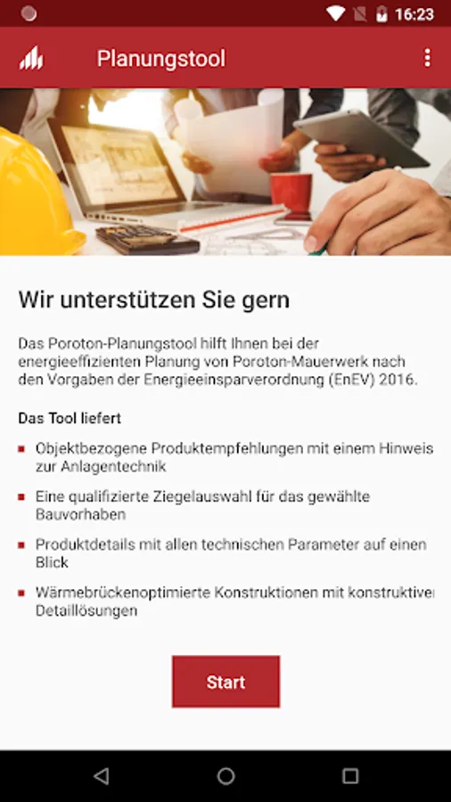 This digital helper supports you in the energy-efficient planning of Poroton masonry according to the requirements of the Energy Saving Ordinance (EnEV) 2016. Depending on the property, the tool also provides suggestions for the suitable Wienerberger products, including all technical parameters.