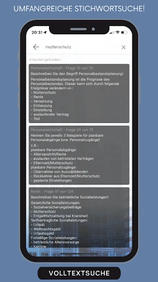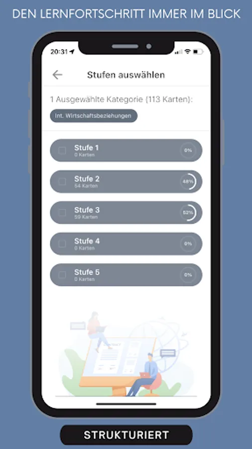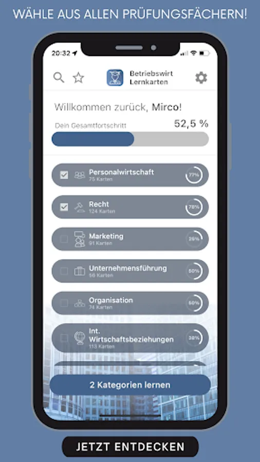 The system is simple, but ingenious: Through systematic learning with flashcards and repeating the exam material, it is more and more memorized. The app recognizes gaps in your knowledge and helps you to eliminate them. Of course, all relevant examination subjects are included: