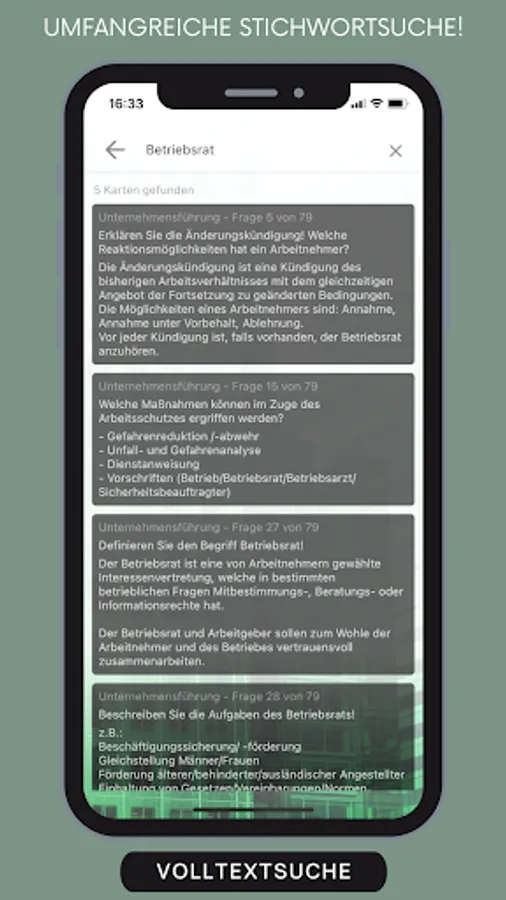 Although we are sure that the content of the flashcard app covers the majority of the necessary exam knowledge, we still recommend acquiring the basic knowledge through exam preparation courses. Books, volumes of texts or scripts from the respective course provider can also help you understand the context of the content.