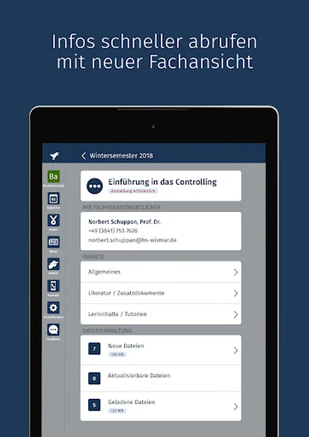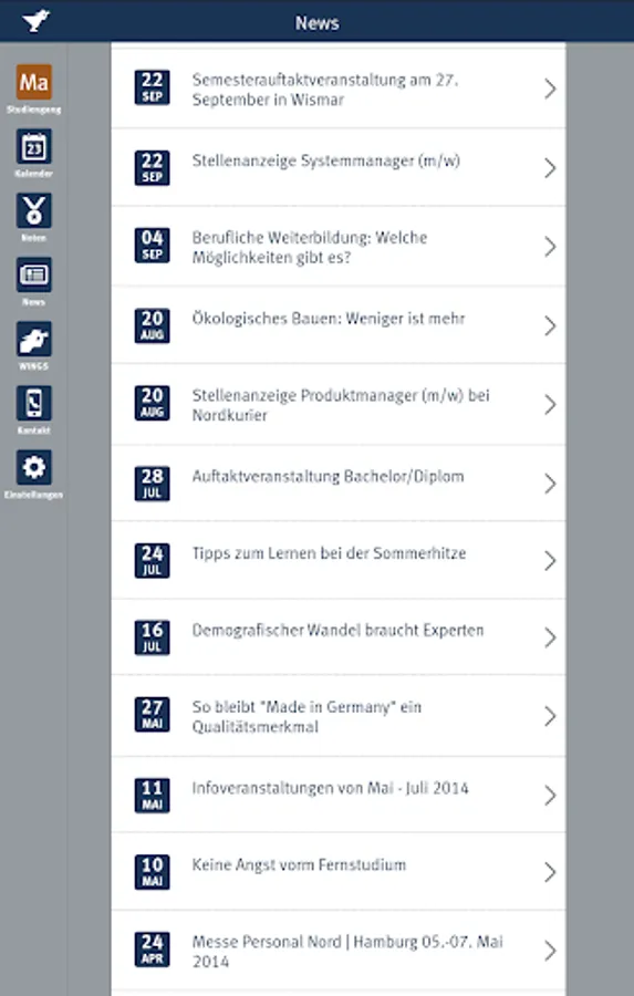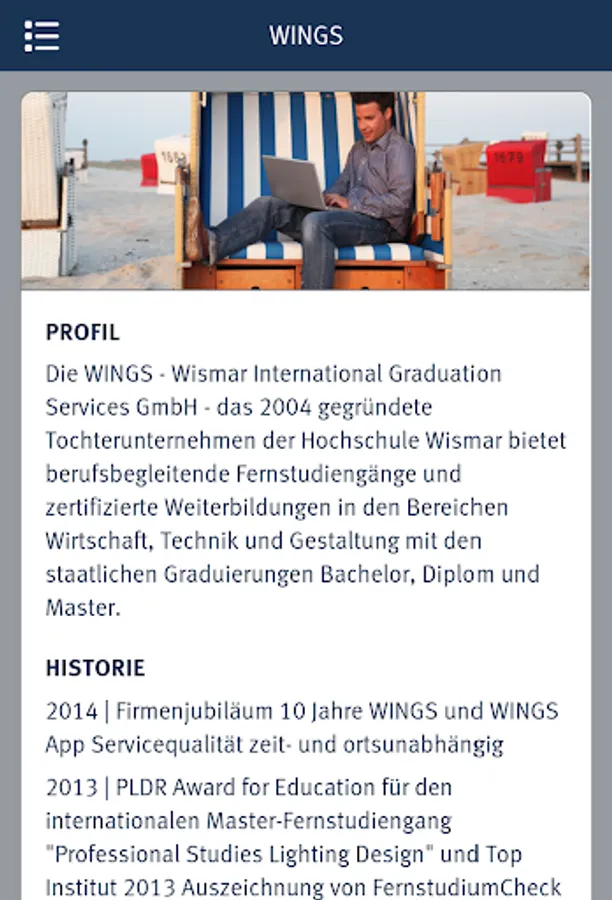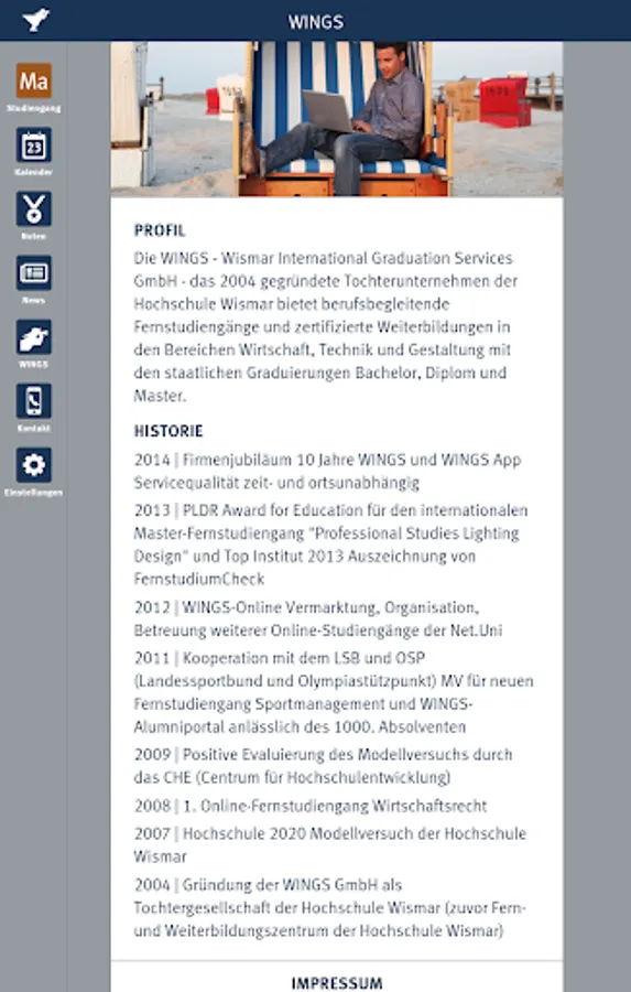 With the WINGS App, as a distance student of the University of Wismar you have mobile access to all study materials and study content, your appointments and events, your grades, your curriculum, the contact persons as well as news around the regular access via your PC to the official study platform Topic distance learning.