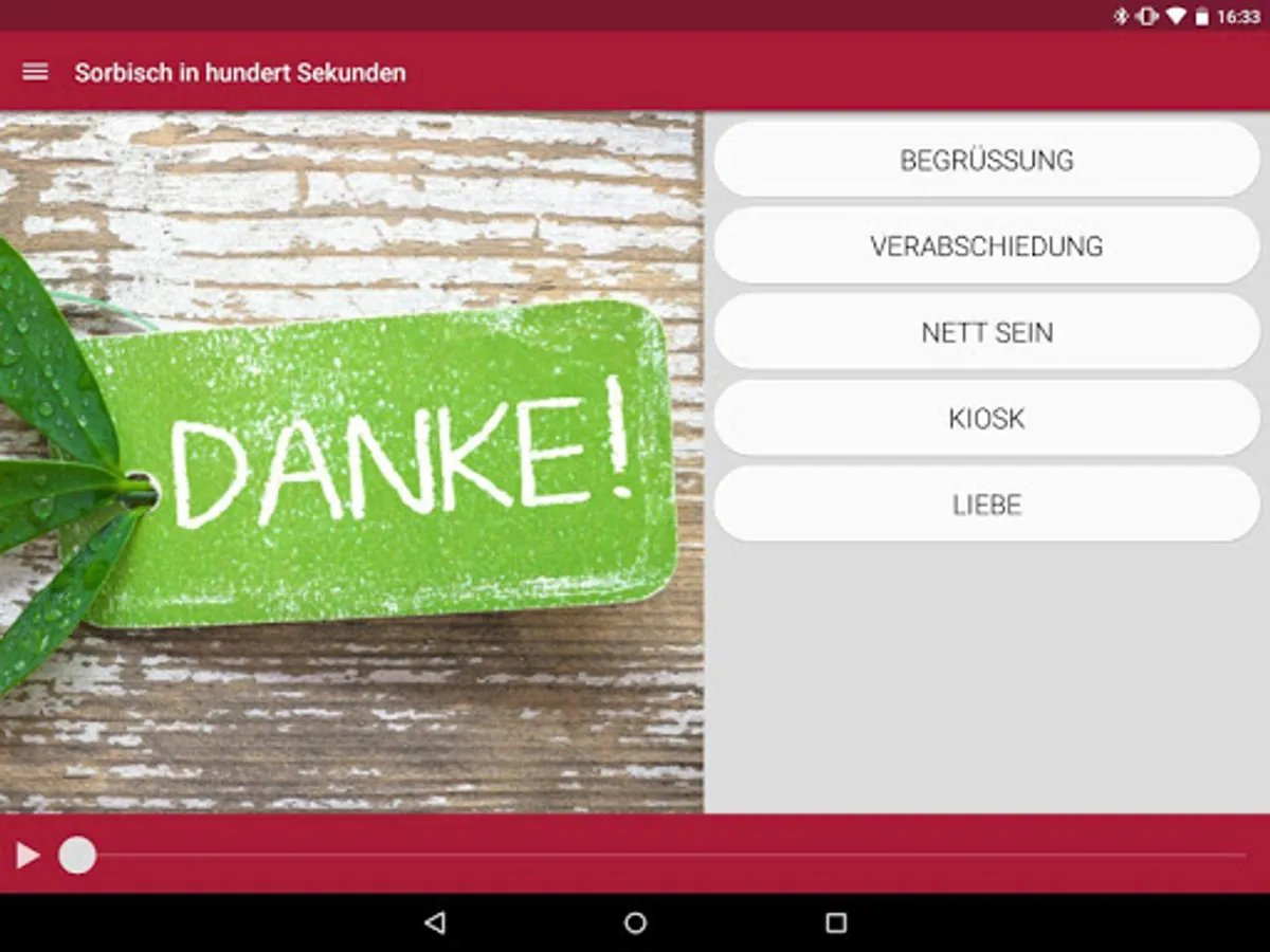 Sorbian in one hundred seconds are short listening texts, which contain interesting information about the Sorbs. The texts are written in German language. It's about welcoming, adoption, niceties about food and drink and to love. Typical phrases are repeated in the Sorbian language.