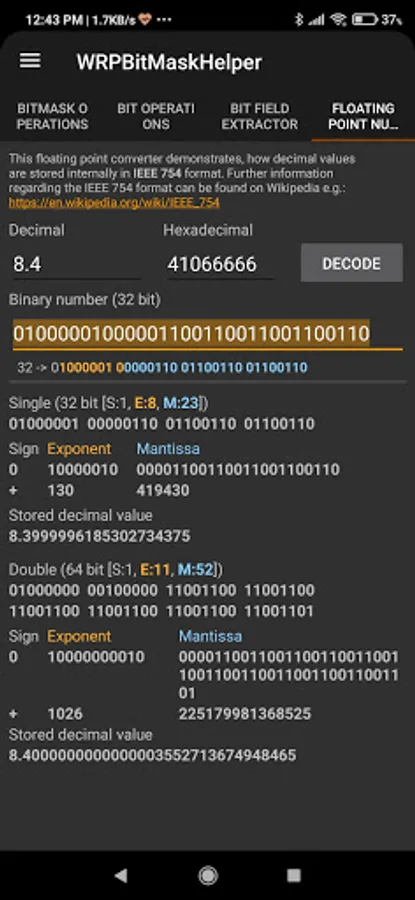 4.) An IEEE 754 converter has been added, which should help to better understand the internal storage of floating point numbers. This topic is relatively complex, even computer science students sometimes find it difficult to deal with this topic at the beginning. :)