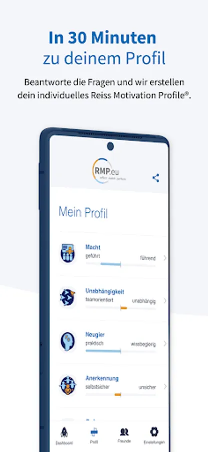 In the app you get immediate access to your personal Reiss Motivation Profile® or you can buy a profile. You can take a look at your inner drivers anytime and anywhere and look at them again before making difficult decisions, for example. You can also share your personal profile with others so that they can get to know you better. In addition, the app gives you further insights into the Reiss Motivation Profile® and explains briefly and concisely what is behind the individual life motives and what influence they have on your life and your actions.
