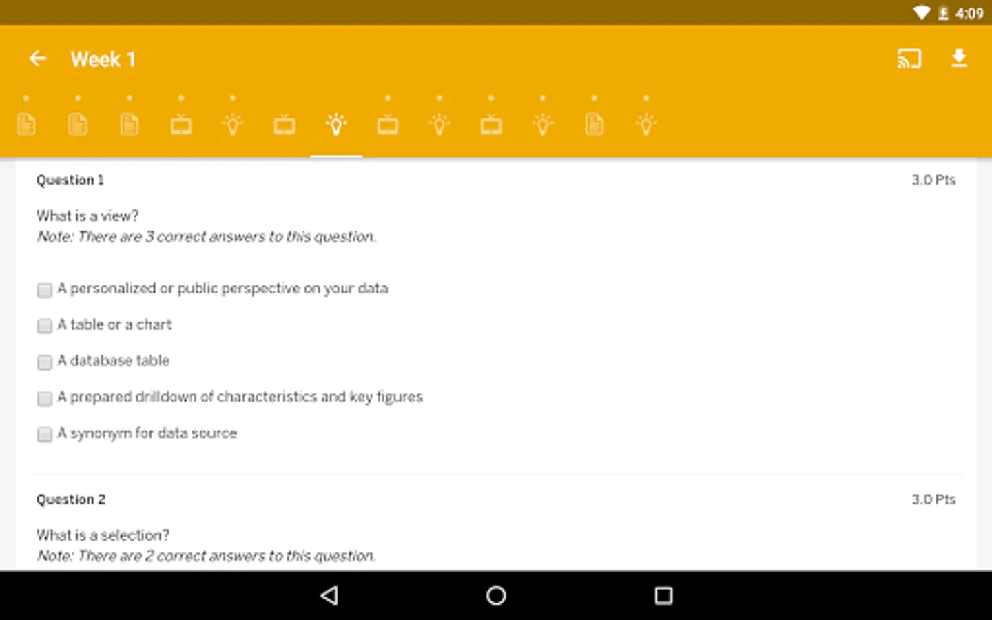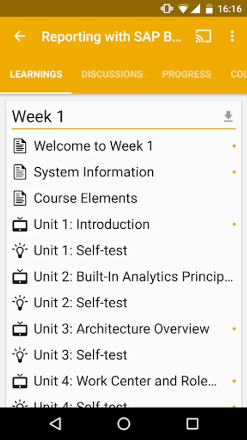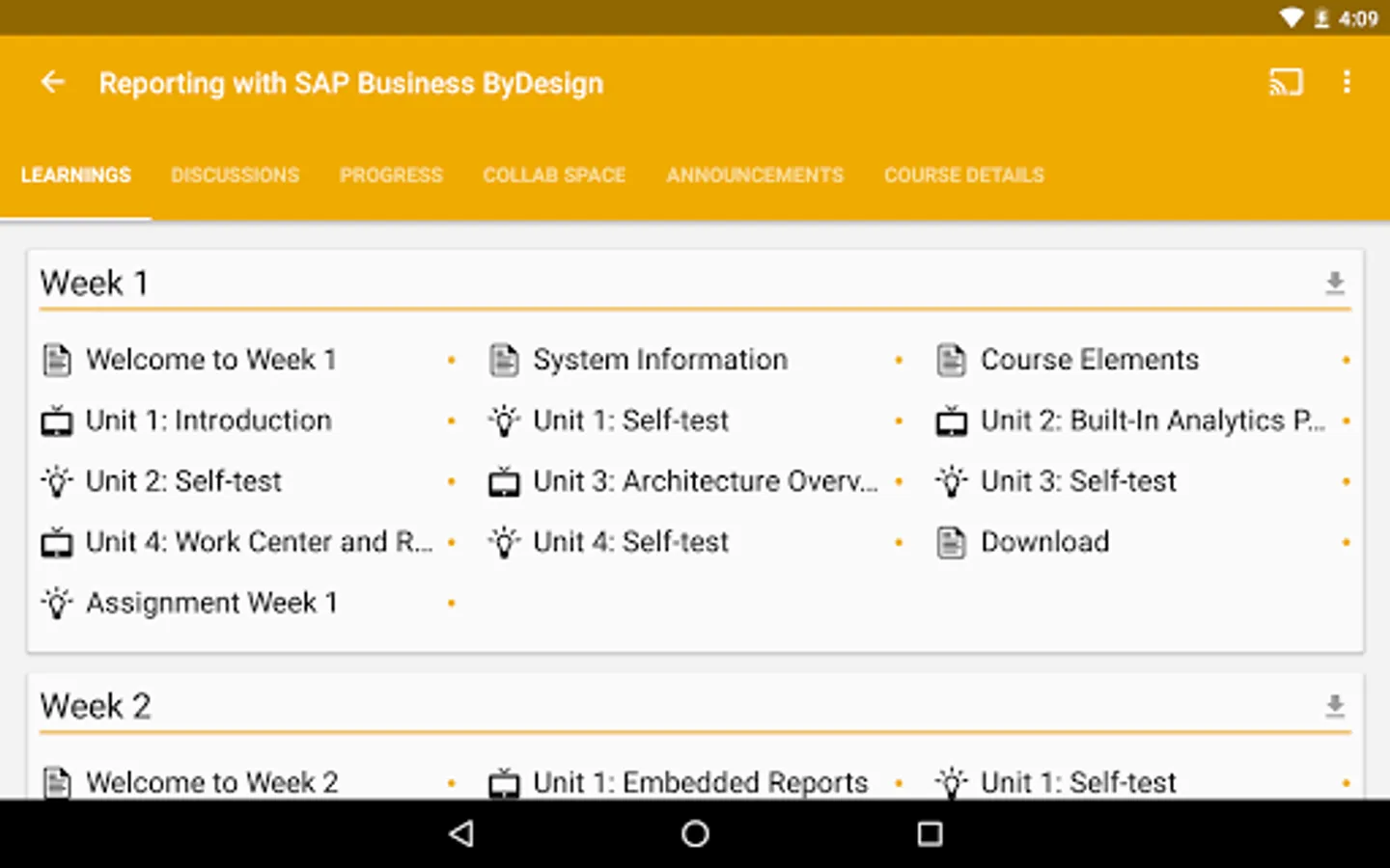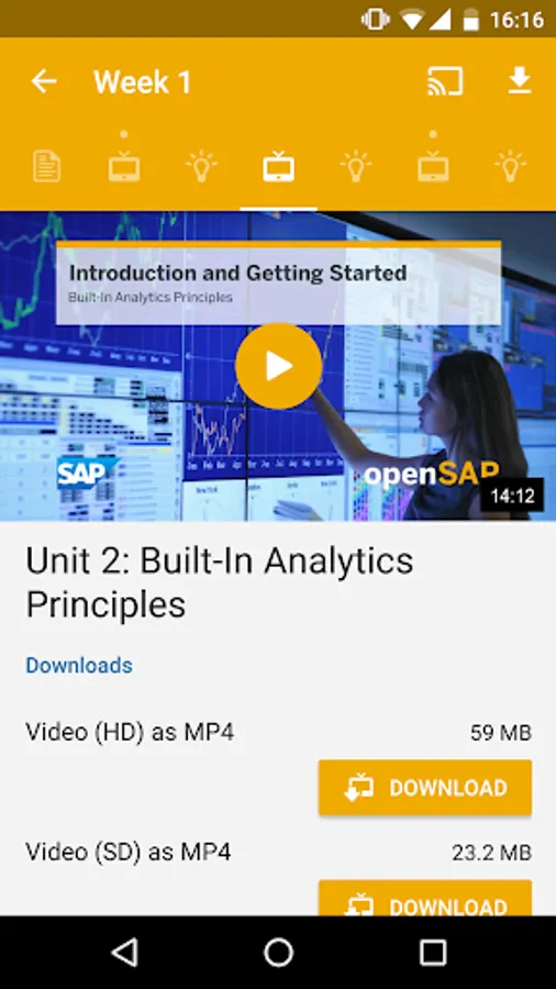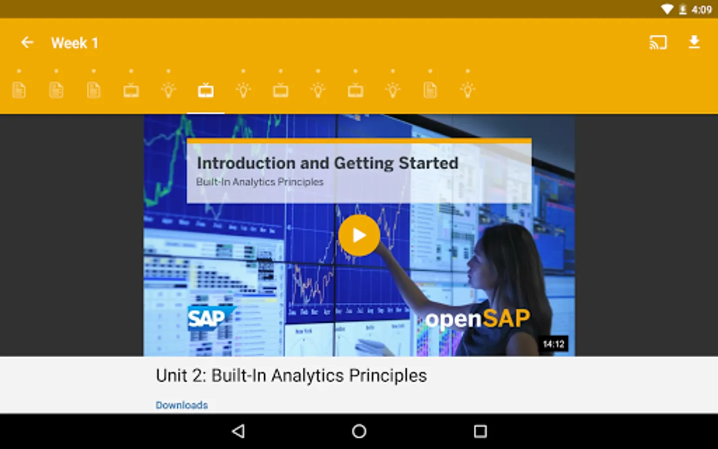 With the openSAP mobile app for Android, you can gain knowledge on key topics for success in the SAP ecosystem anywhere and anytime. This app accesses SAP's open online courses and provides a well-structured, optimized interface for you to view available courses, download course videos, complete online tests, and synchronize your personal learning progress with the openSAP web platform.