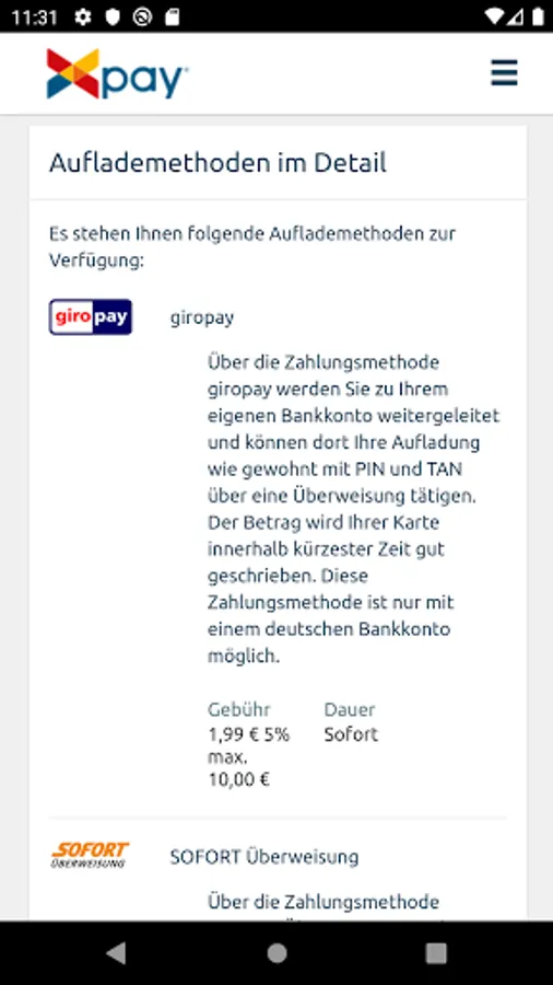 You can load your card either by bank transfer or by giropay. Select the "Top up" option in the XPAY app. All charging options and how to proceed are displayed there. Please note that bank transfer is only available if you are identified as a customer with a limit extension.