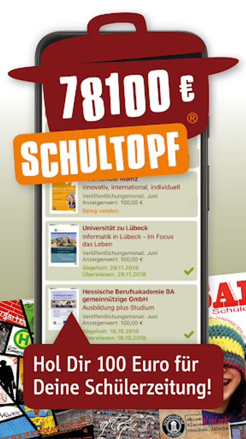 The project Schultopf organizes sponsorship for yearbooks, school and school newspapers. Behind Schultopf is studieren.de - Germany's first and leading search engine for degree programs. The team of studieren.de teaches with Schultopf ads from universities and colleges from all over Germany directly to the interested schools. All pupils and teachers from schools, where a university entrance qualification can be acquired, can participate.
