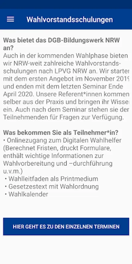 With the app you also have an up-to-date overview of the dates and locations of our election board seminars, including registration status and an overview of the dates and locations of the two basic training PR I and PR II for a good start to the term of office after the election.