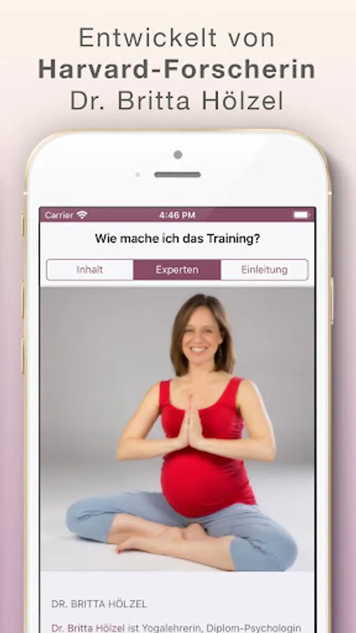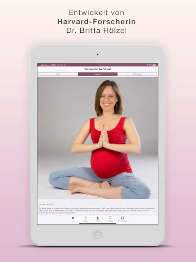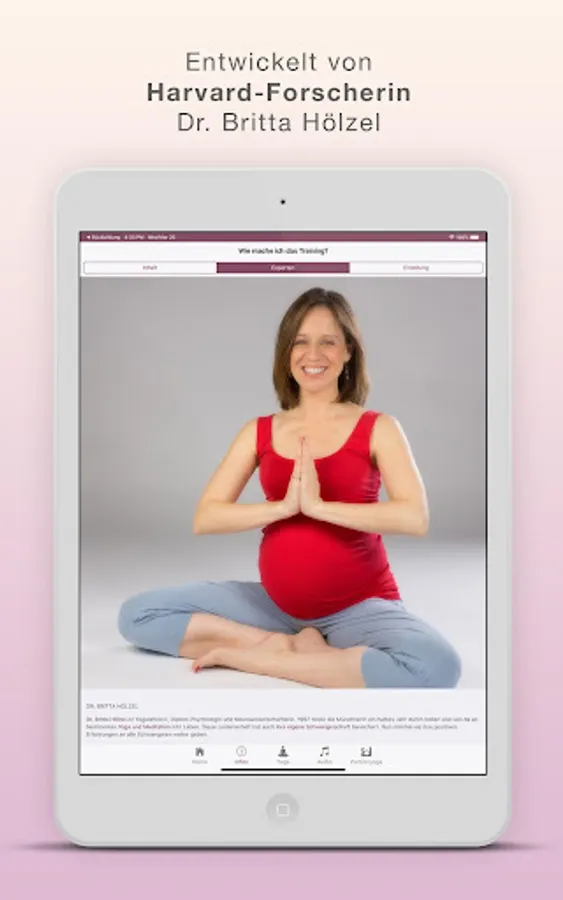 You get 5 yoga sets and have lifetime access to them. Each yoga sequence has a different focus that Dr. Britta Hölzel responds to the respective needs of pregnancy and prepares you for the birth. The psychologist and yoga teacher demonstrates the exercises and is pregnant herself when the recordings are made.