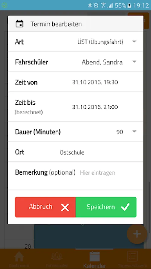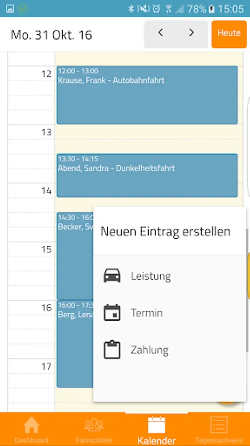 The integrated diary displays all your appointments. Of course, you can also create new appointments that you have just discussed with your students. For an appointment, you can create a single click a performance that can be signed directly from your students.
