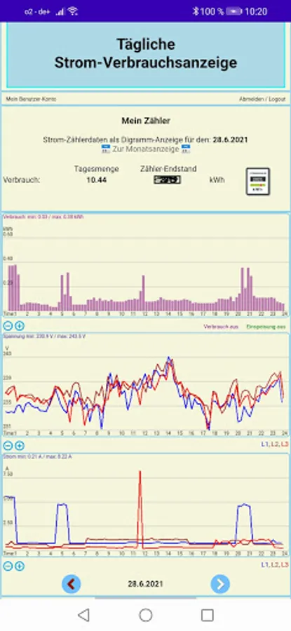 This app runs in conjunction with an external data server. The logger, which is attached to the electricity meter, sends the meter readings. The app shows these values again in chronological order.