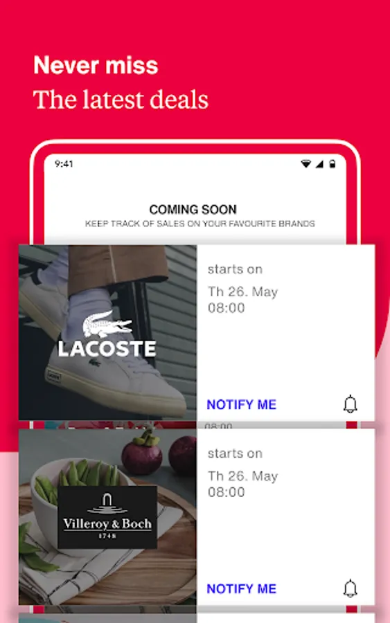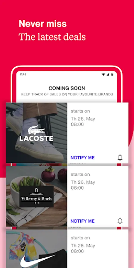 Follow us on Instagram and Facebook and you'll be one of the first to hear about our deals. Interested in vouchers? You'll receive personal notifications and exclusive vouchers as soon as your favourite brands go on sale – as well as our savings! If you follow our designer outlet on social media, through our newsletter and push notifications, you'll receive extra vouchers to use on Lounge. Registration to our app is totally free.