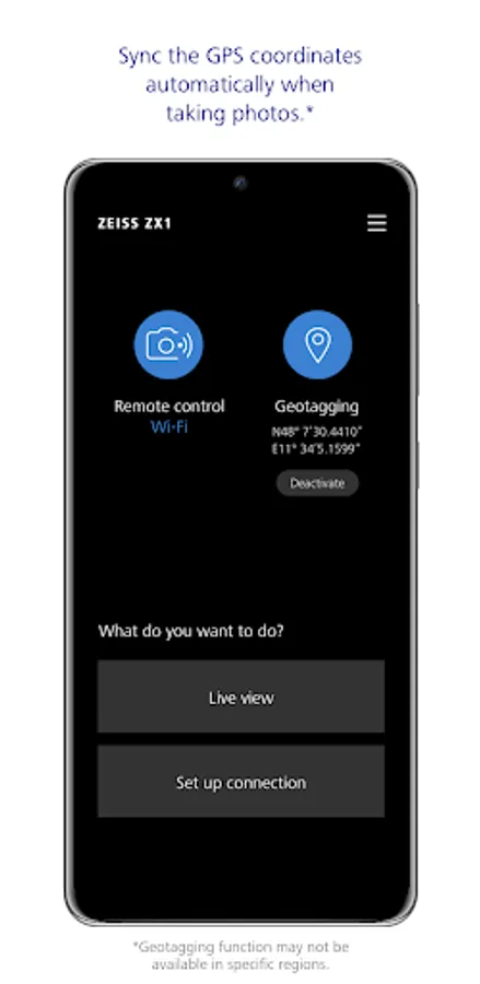 With the geotagging function, you can embed the GPS coordinates in the image EXIF data when taking photos. Location services and Bluetooth must be activated on your smartphone.