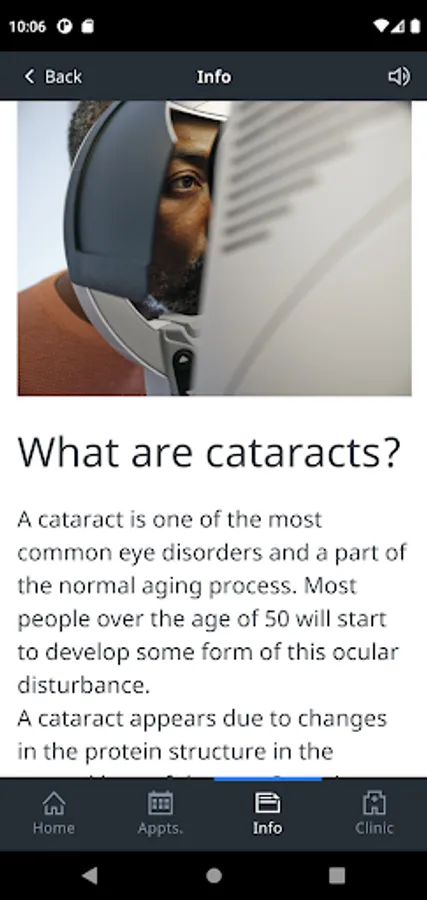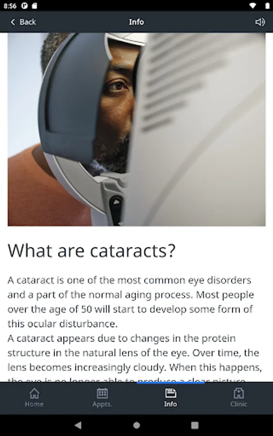 EYEGUIDE is a new app for cataract patients assisting them during the entire cataract treatment journey. In this app you will find helpful information about cataract and cataract surgery, as well as useful tools helping you to prepare for the cataract procedure and to optimally support the healing process.