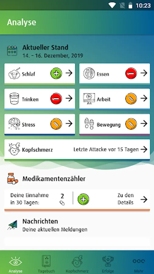 • 'Headache knowledge' gives you an overview of how often you take headache medication. It warns you when there is a risk of headache from overuse of medication.
