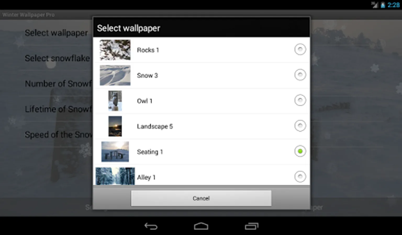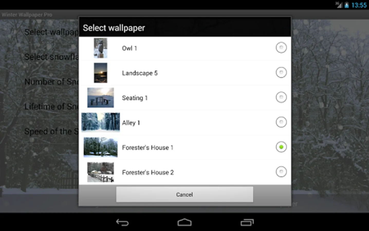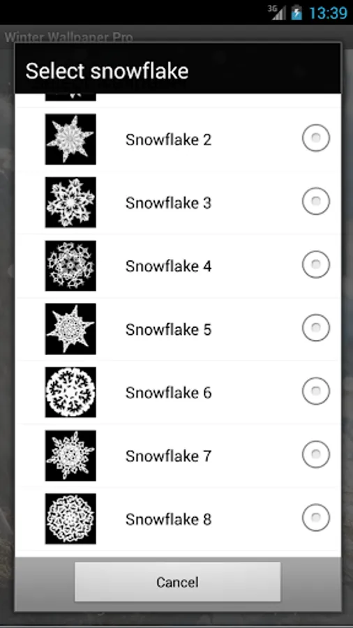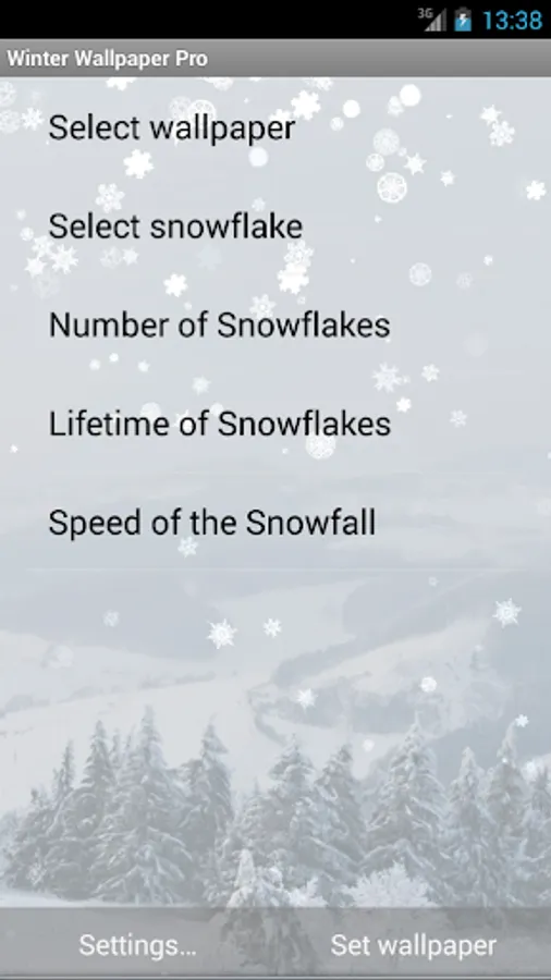 Choose your favorit from 29 different pictures. You can also select between 12 snowflake styles or have all together. The number of snowflakes and the speed of the snowfall can be set, too. There are further options to change the snowfall to your liking.