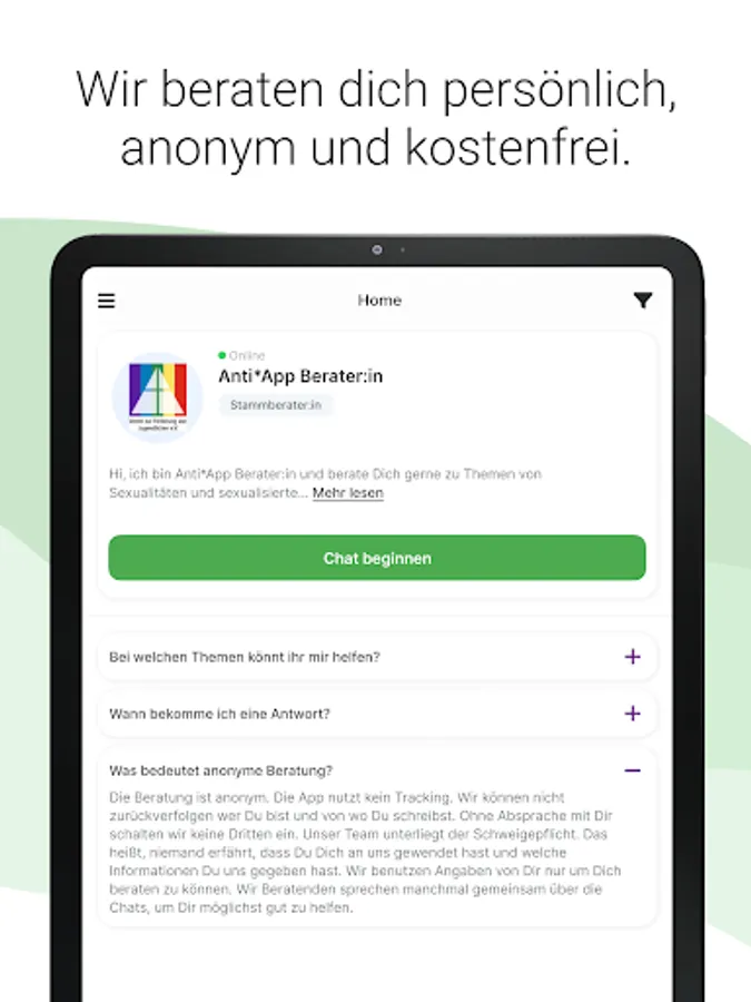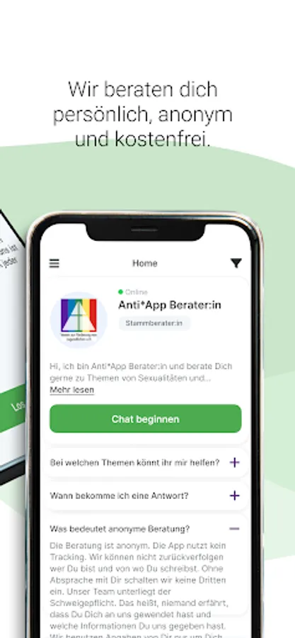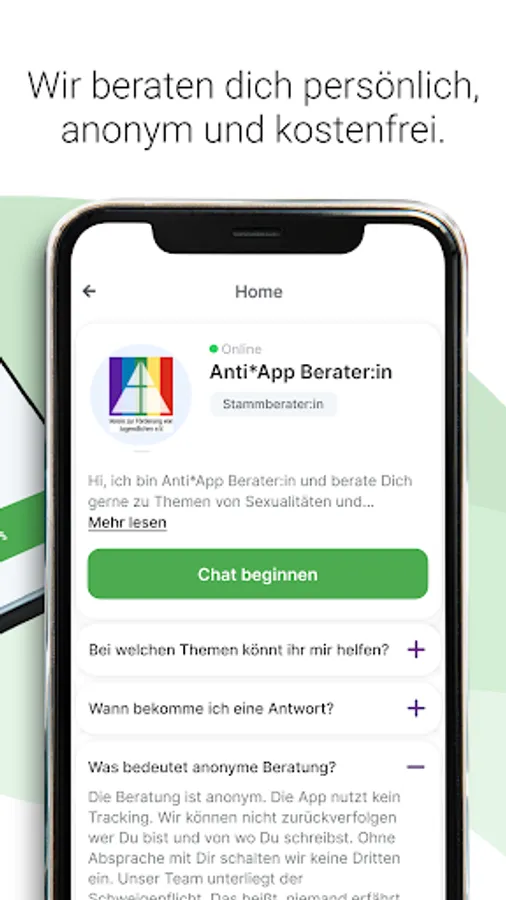 The Anti*App is a way to get information, advice and help with questions about sexualities quickly, anonymously and free of charge. The professional team also provides support in cases of sexualised violence. By networking with other advice and specialist advice centers in Germany, help can be organized on site if necessary. The app is aimed at people between 10-27 years of age. The counseling team consists of psychologists and social workers and is run by the Association for the Promotion of Young People e.V. in Stuttgart.