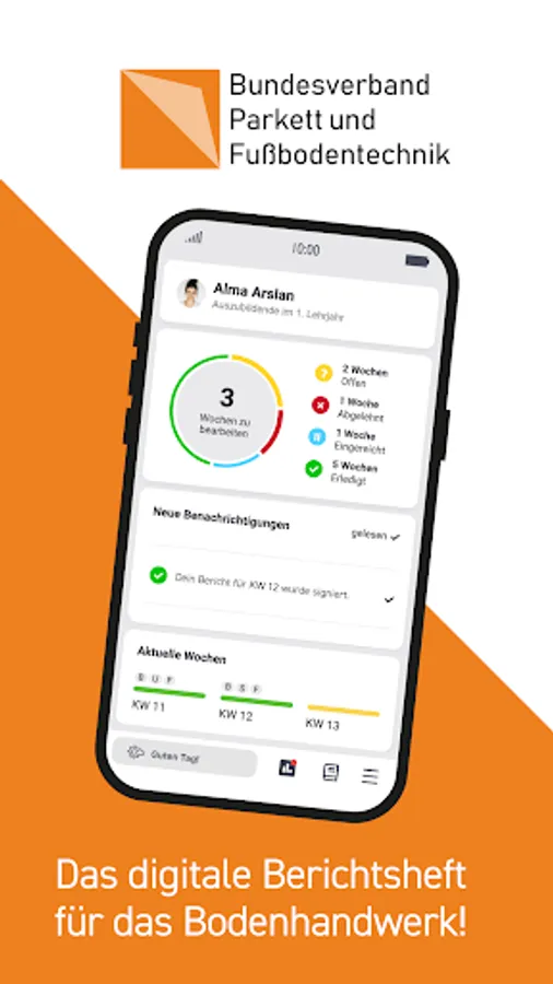 The better digital report booklet - online and as an app. For trainees, trainers, companies and vocational schools. The trainee app for the floor trade is the digital answer to report book templates: fast, up-to-date, online, easy to use and full of smart functions for training. Start now!