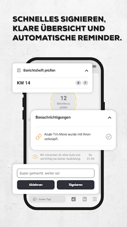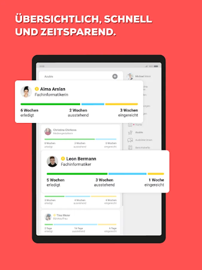 Have all trainees and tasks at a glance and save a lot of time and nerves. The trainee app is suitable for all HWK and IHK professions and optimally supports vocational training. Practical functions make work easier.