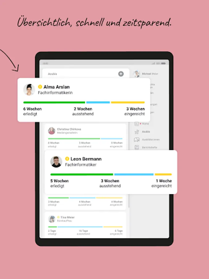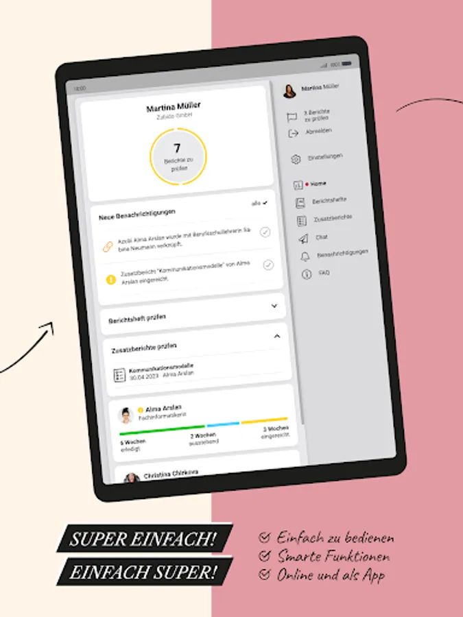 Have all trainees and tasks at a glance and save a lot of time and nerves. The trainee app is suitable for all HWK and IHK professions and optimally supports vocational training. Practical functions make work easier.