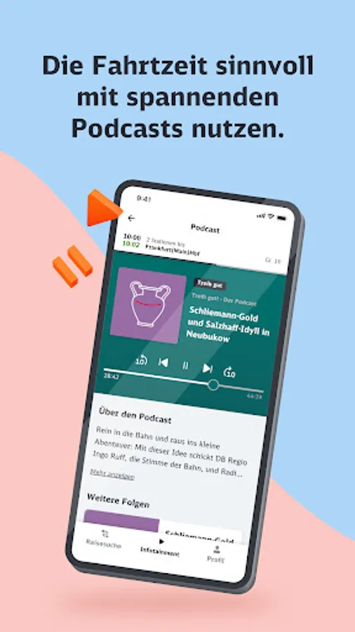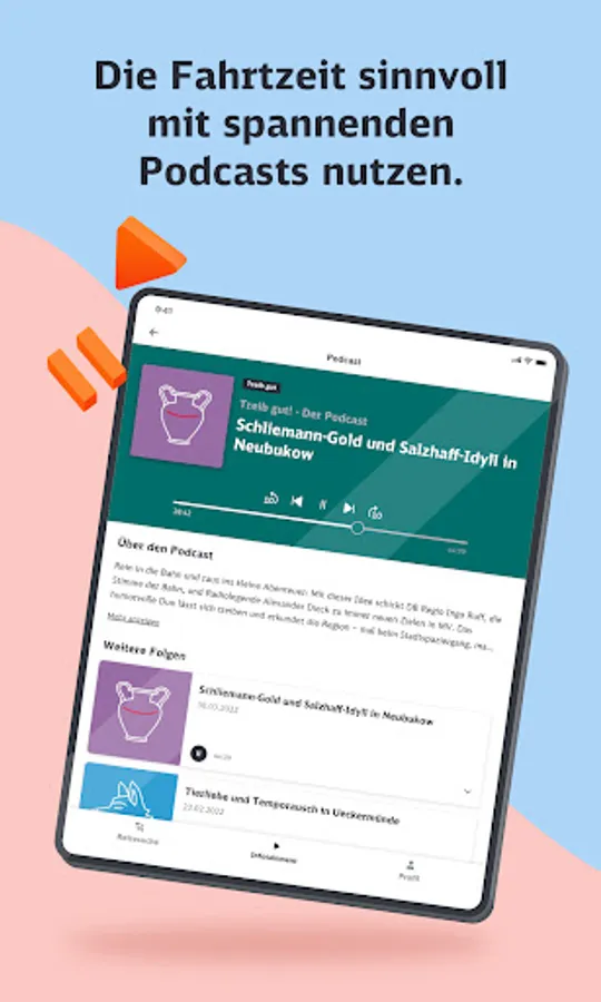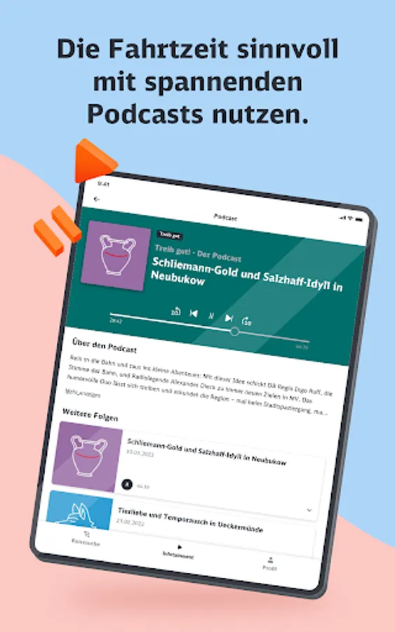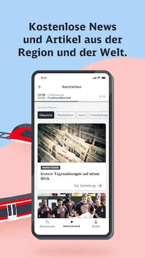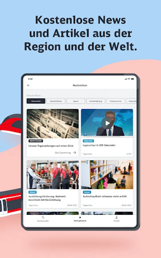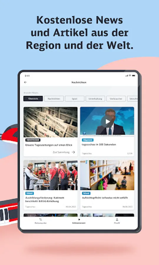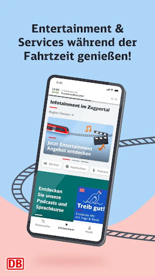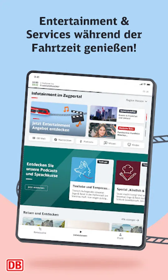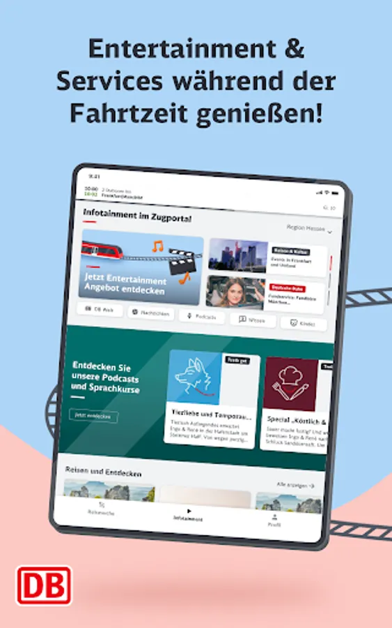 The infotainment area focuses on regional information, a news mix that changes daily and other offers from the areas of knowledge and entertainment. Here the passenger can access a wide range of content from our many partners. In addition to the content of DB mobil, he will find numerous podcasts, short language course units or exciting knowledge articles to use the travel time sensibly.
