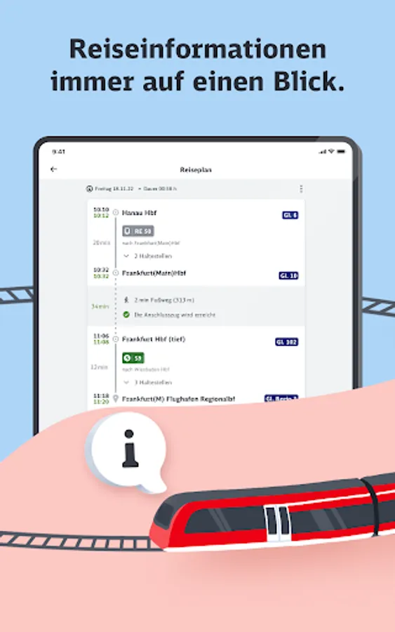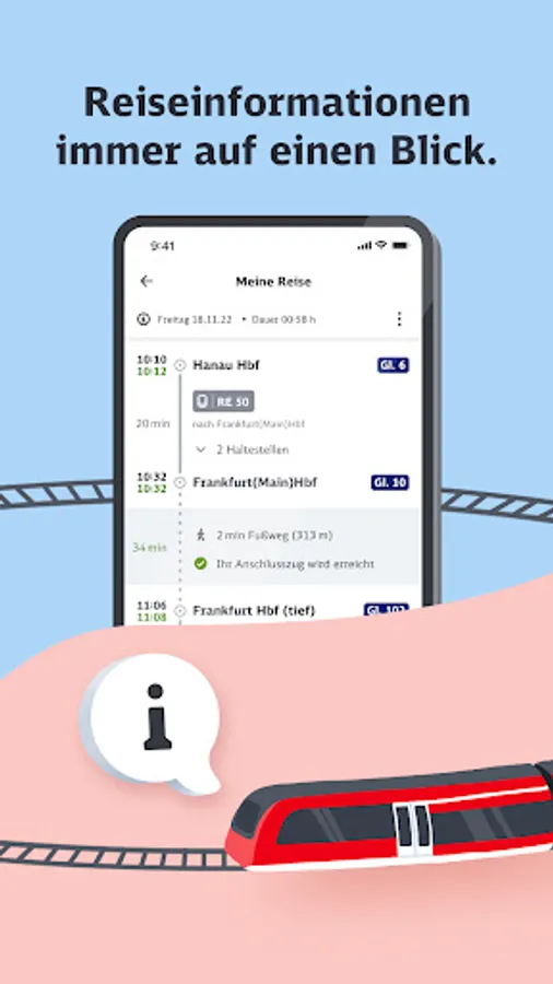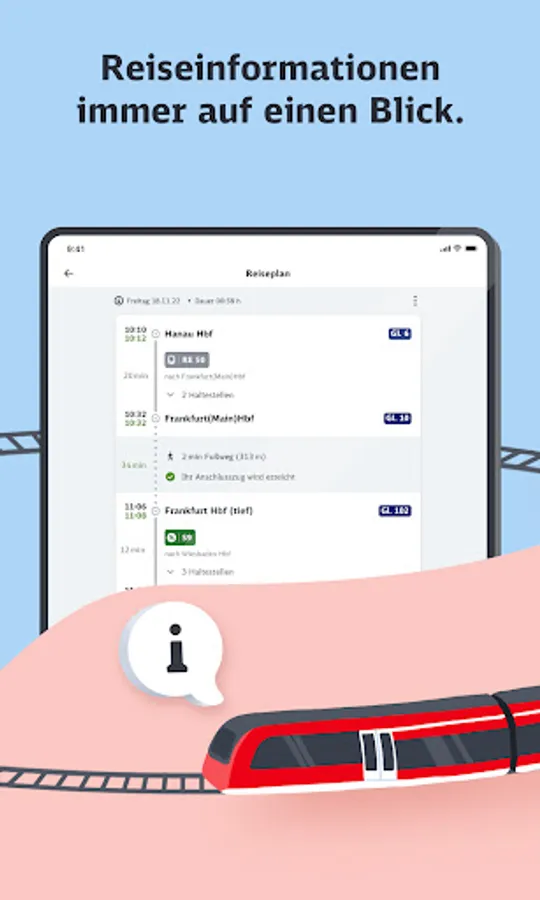 The travel information is always visible to you at the top edge - regardless of what content you call up in the train portal. This gives security and you can surf as you please without having to interrupt this to quickly check departure and arrival times or the next stop.
