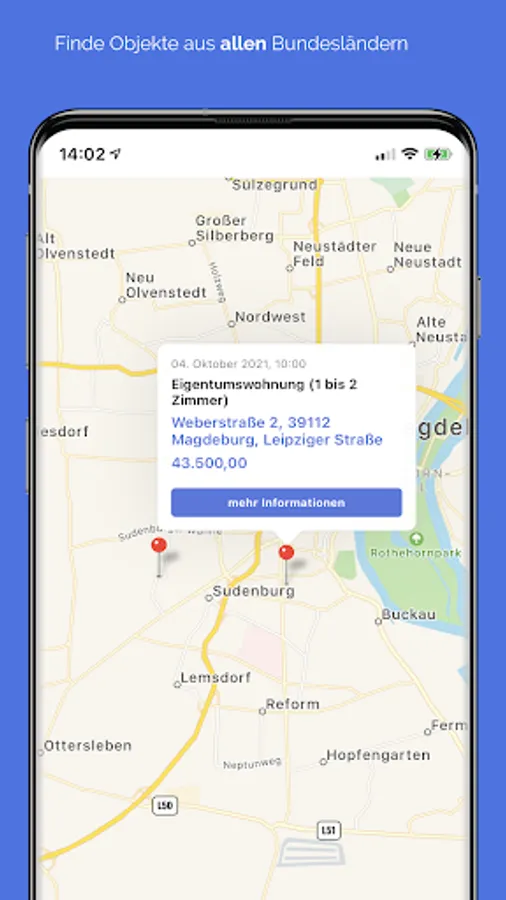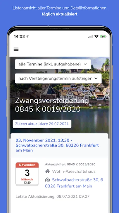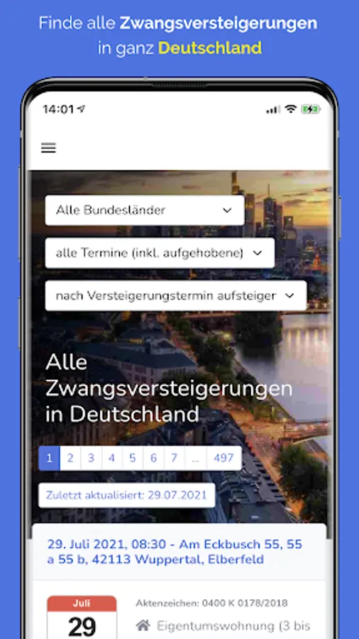 Here you can find current dates and updates on foreclosures from all federal states. The app bundles public information from various local courts.