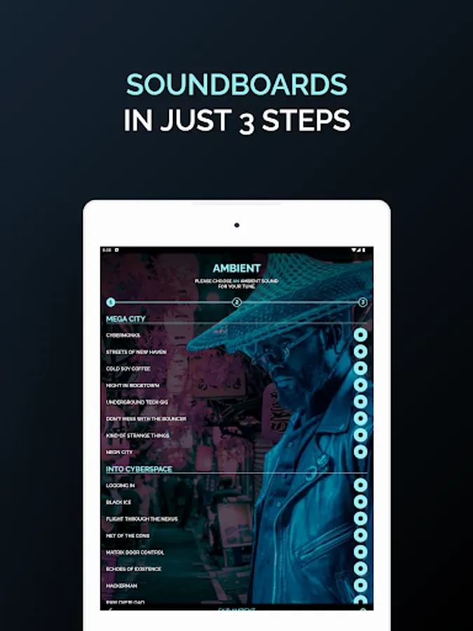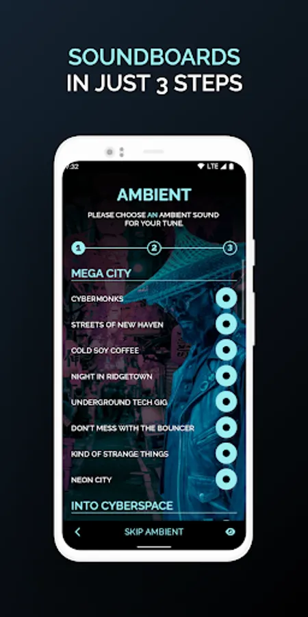 Want to create a tune for a Cyberdive? Then choose an ambience from "In the Megacity". In the following two steps for sounds and effects, the same category is selected first.