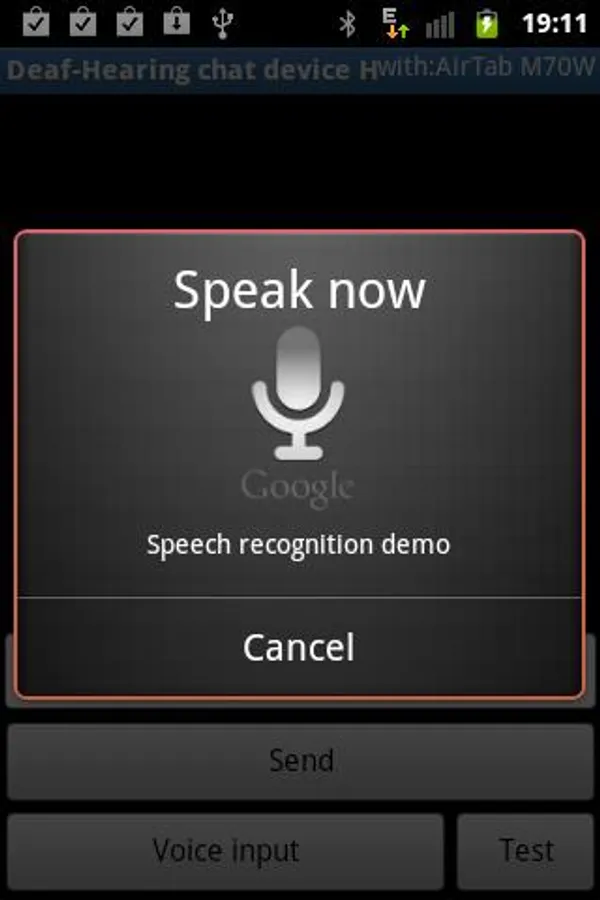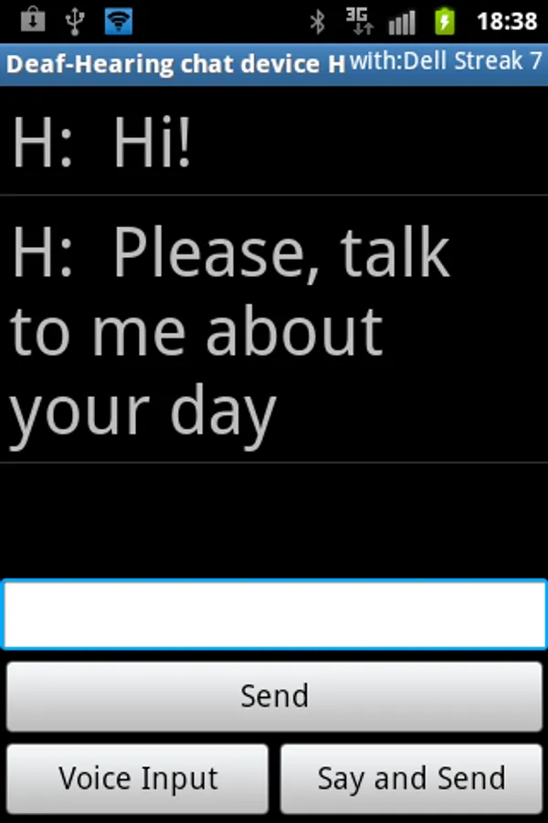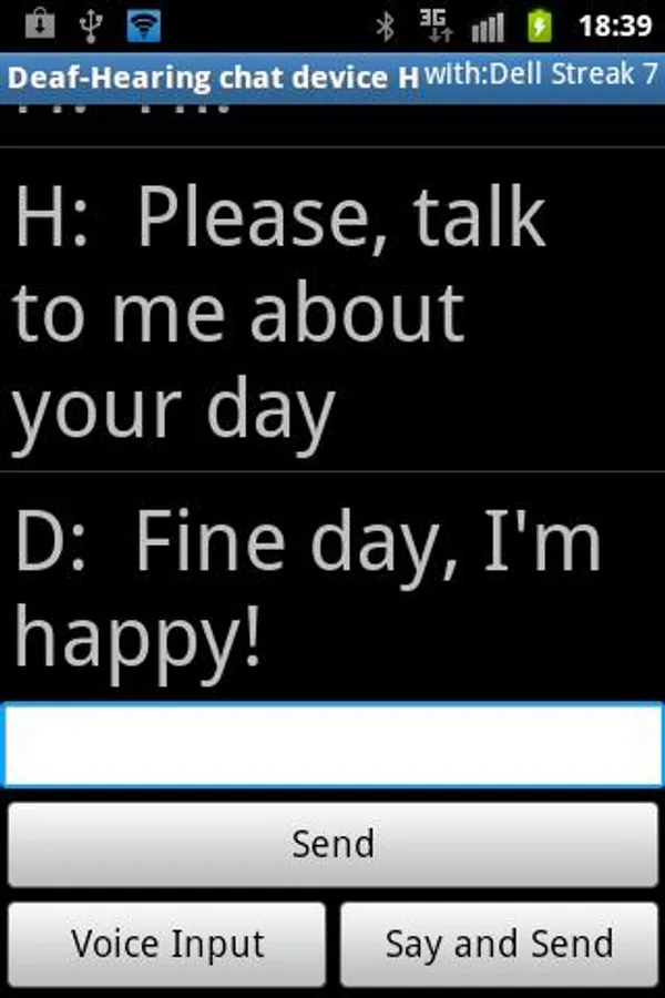 The application for the device-H, called Deaf-Hearing Chat, enables a hearing person to type text messages on a virtual keyboard or using voice input (the button “Voice Input” or the button "Say and Send" ). You need an Internet access for voice input. To send a message to the second device you should press the button “Send”. The messages, received from the second device, are shown on the display.