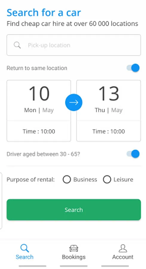 To use that car booking application is very easy. The application (discount car rental) has a professional and user-friendly UI/UX which is very easy to use. Anyone from any age group can use it very easily. You just need to open your car rent app here are just a few steps that you will use to get your dream trip car for rent. You just need to select your location, pick up date and drop out date and that's it. Our enterprise car rental application algorithms will provide you the best cars for rent from our database.