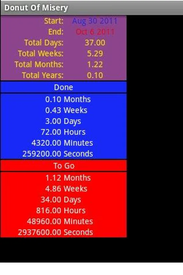 Have a loved one who is going to be away for a while? Want to keep track of when they left and when they will return? This is similar to the spreadsheet that is floating around the web for creating a "donut" depicting how much time has passed since an event started, and how much time remains until it ends. Many people with loved ones in the service and stationed overseas use it to know when they will come home. You could also use it to track when a rotating schedule starts and ends. You can make multiple "donuts", and save them for recall later.