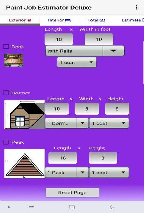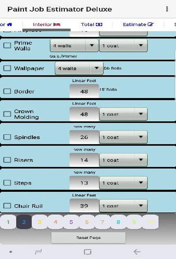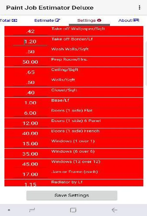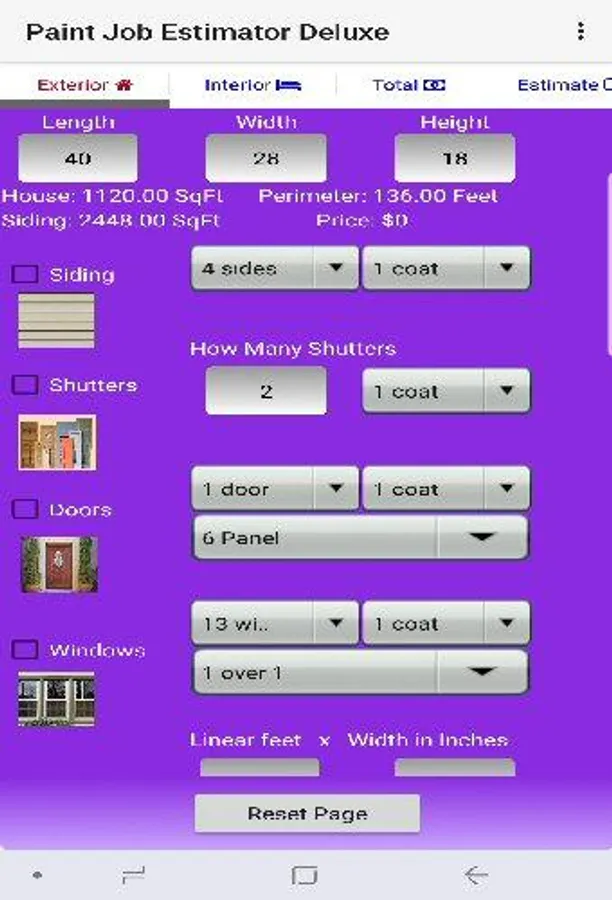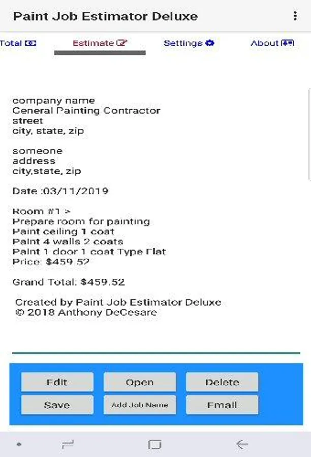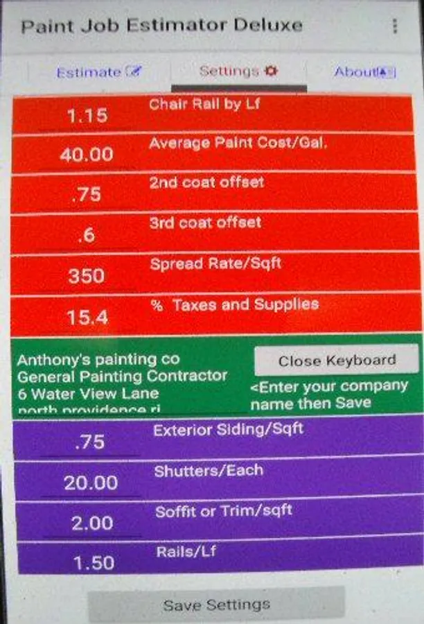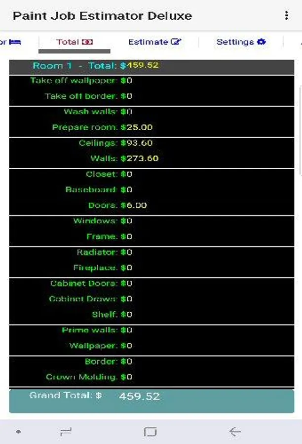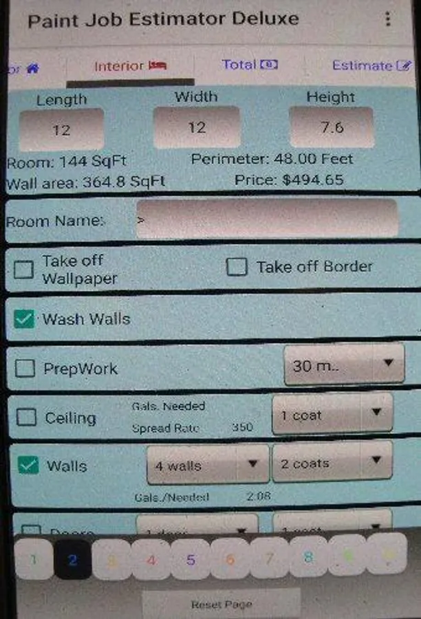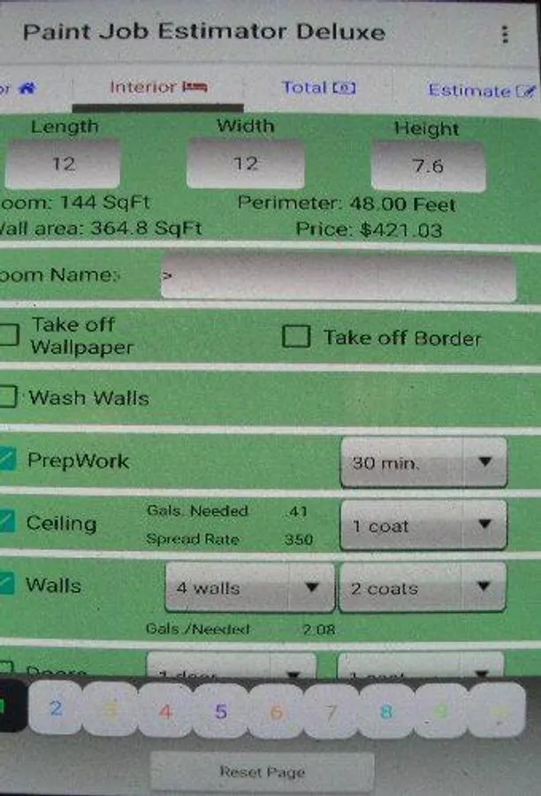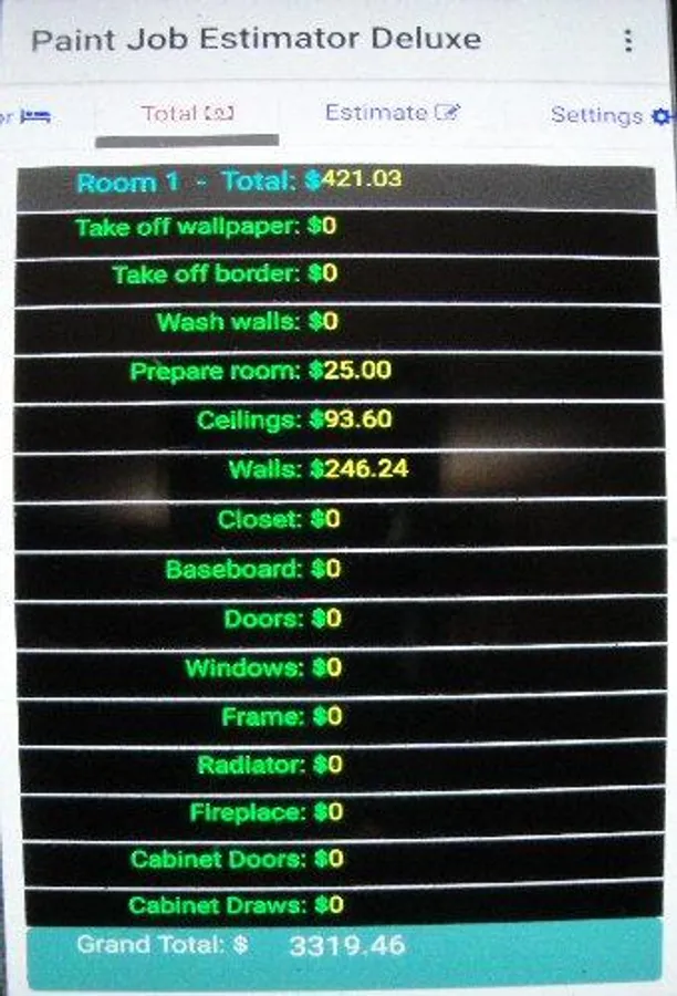 Painting Job Estimator Deluxe is for pricing the exterior of a house and or up to ten rooms for painting at one time. Enter room length, width and height to calculate square footage, perimeter and wall area. Just select what you are painting in a room or on the exterior of the house and you get the price. Displays detailed pricing information for each area. Creates estimate automatically. It also calculates how much paint and or wallpaper you need to do the job. Paint Job Estimator allows you to accurately bid on a painting project. You can also save your estimates to a file or email to yourself or your customer.